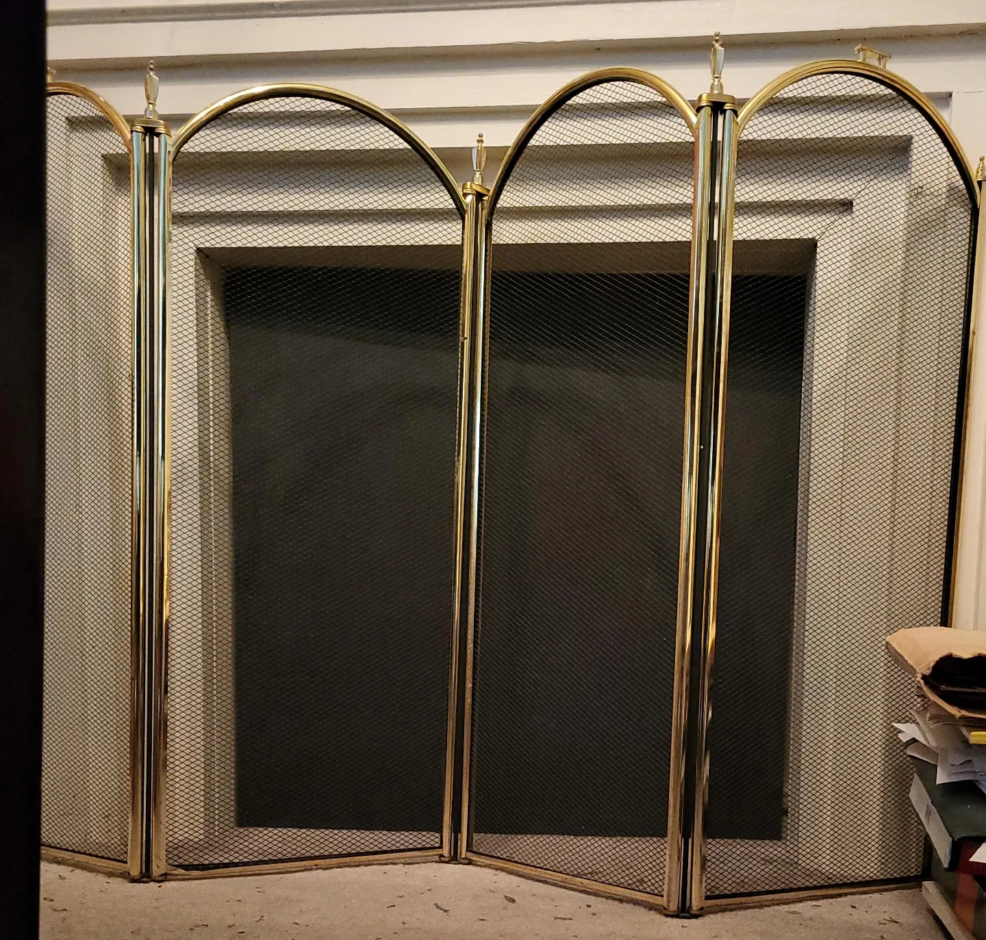 A folding fireplace screen with a brass finish and mesh panels. It folds compactly for easy storage. Great for keeping sparks contained while adding a touch of elegance to your hearth!