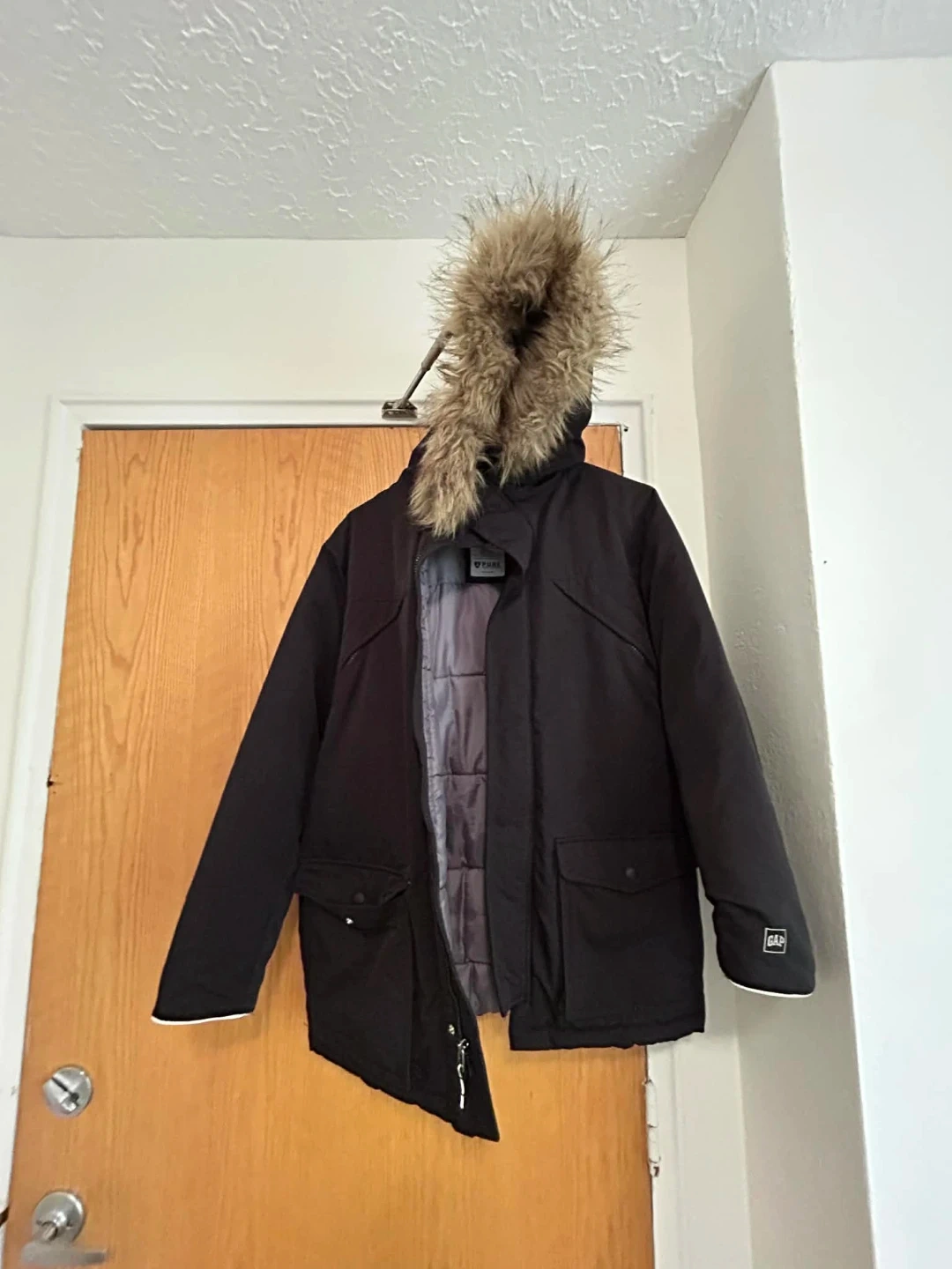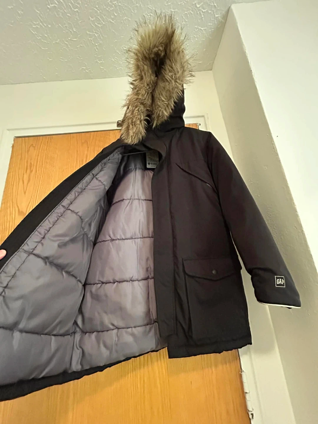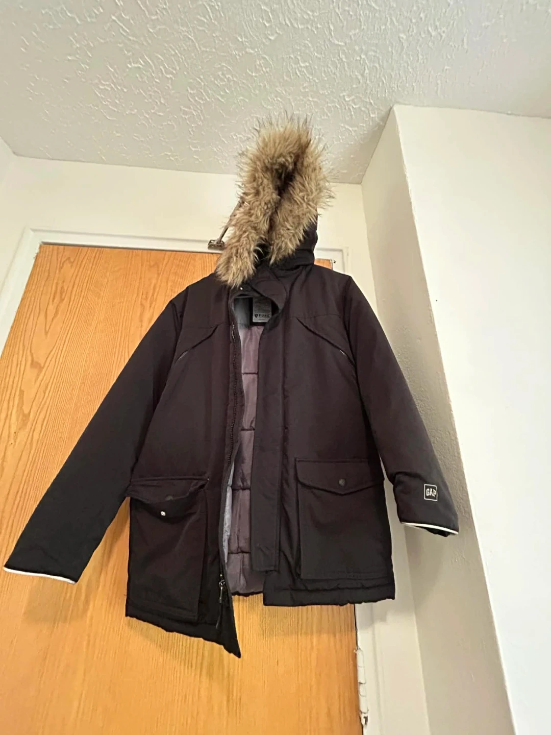 Warm black parka jacket from GAP. It's insulated and features a removable fur-lined hood. Two large flap pockets on the front. A great jacket for cold weather!