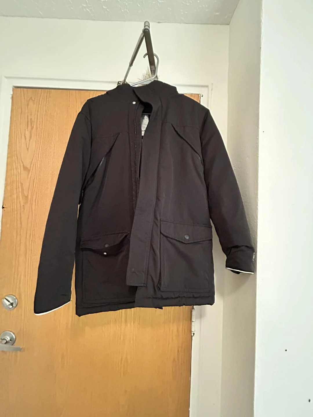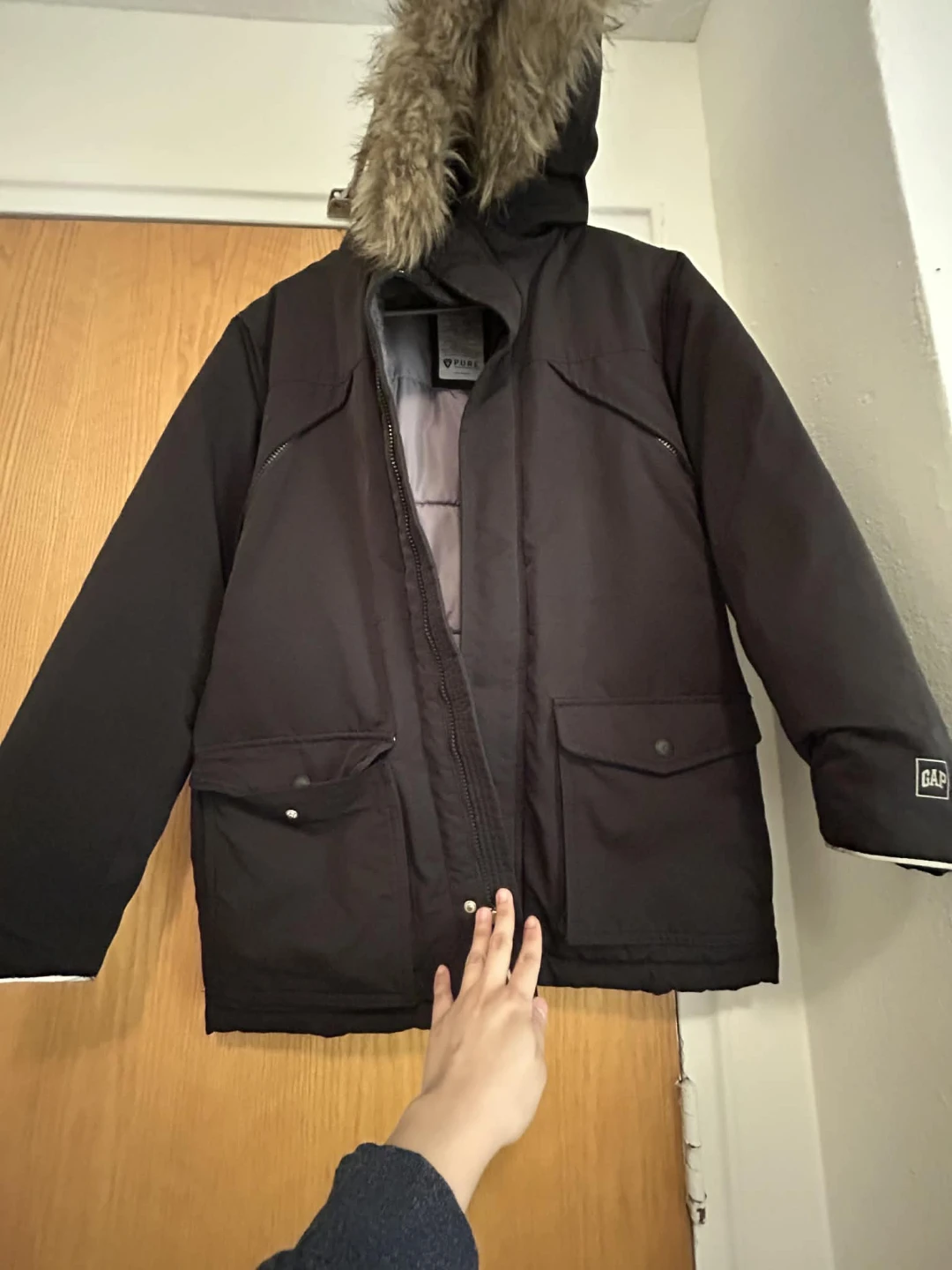 Warm black parka jacket from GAP. It's insulated and features a removable fur-lined hood. Two large flap pockets on the front. A great jacket for cold weather!