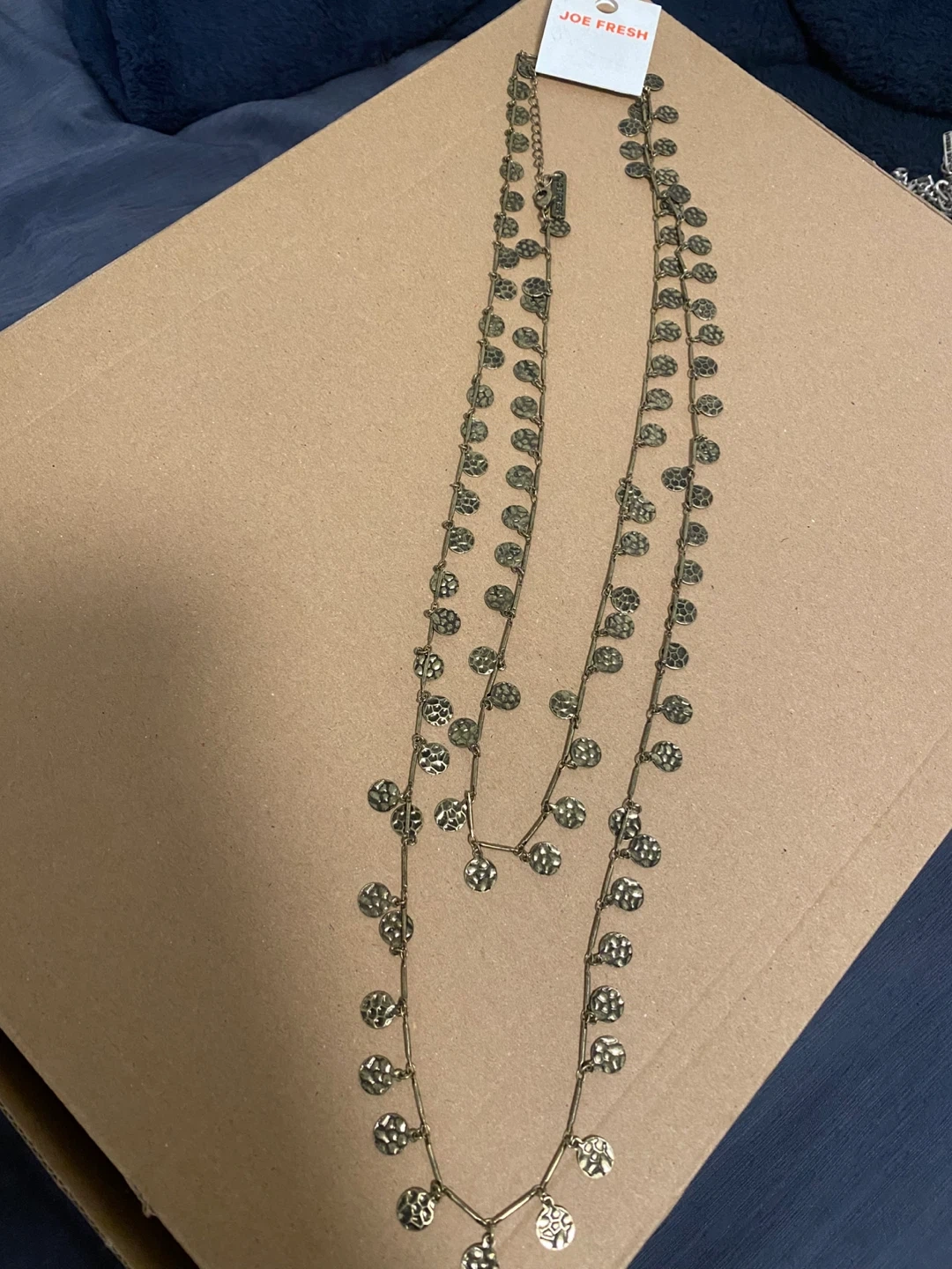 This is a layered pendant very long necklace from Joe Fresh. It's made of a gold-tone metal with hammered disc charms. The necklace has an adjustable clasp for a custom fit.