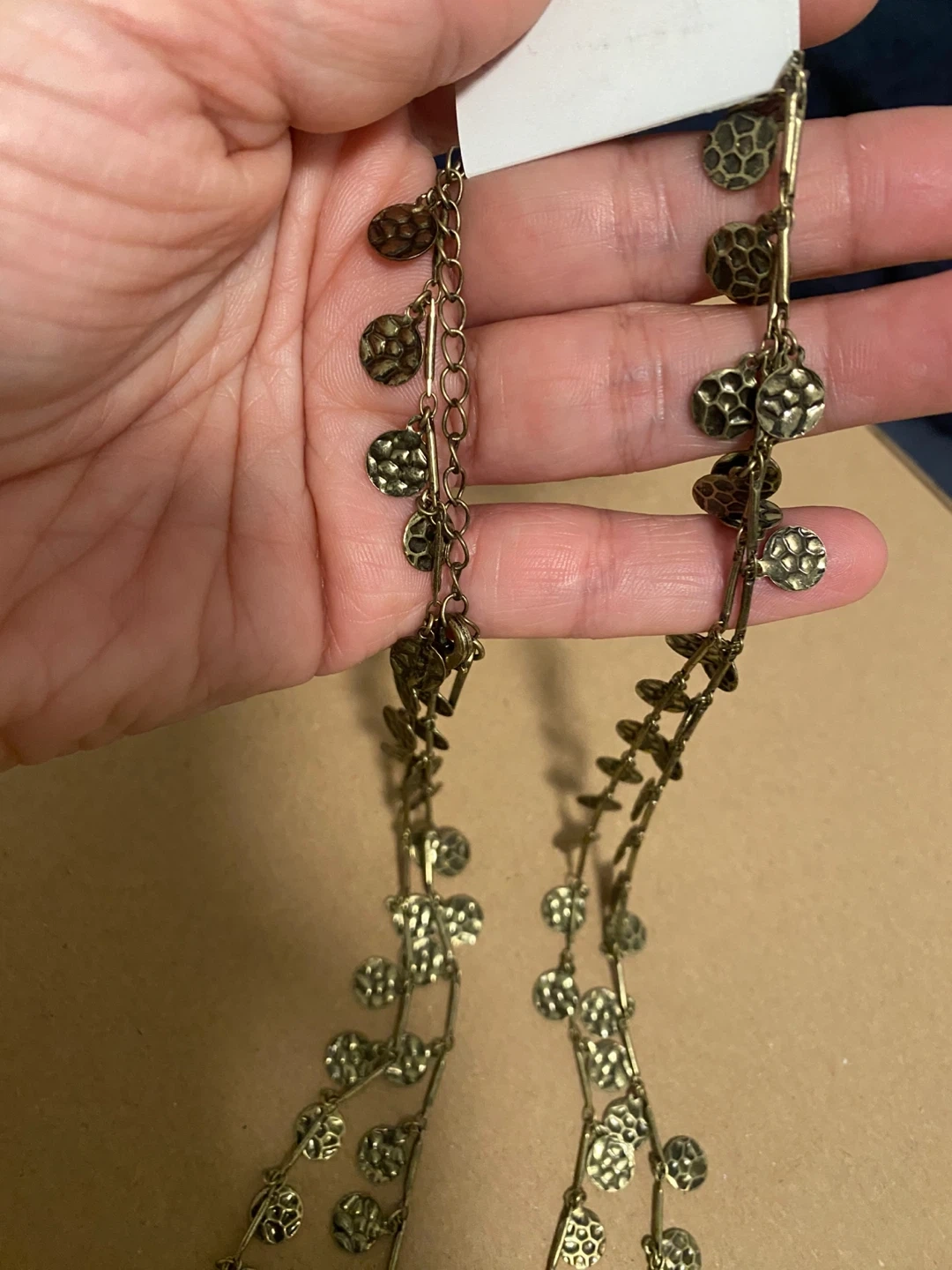 This is a layered pendant very long necklace from Joe Fresh. It's made of a gold-tone metal with hammered disc charms. The necklace has an adjustable clasp for a custom fit.
