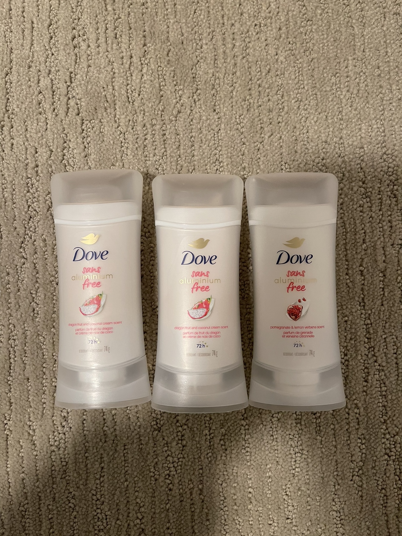 Selling three Dove aluminum-free deodorants. One is dragon fruit and coconut cream scent, and another is pomegranate & lemon verbena scent. Each deodorant is 74g