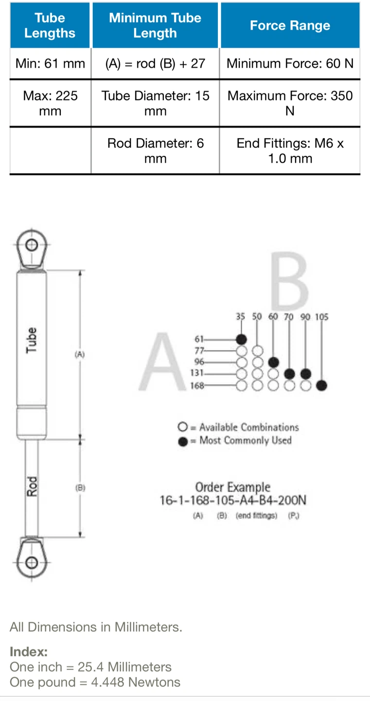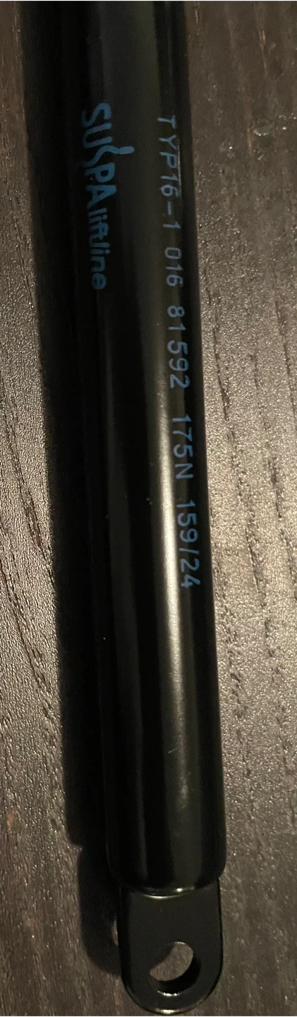Selling new Suspa Airline gas spring strut. It's in good working condition. The model number is TYP16-1 016 81592 175N 159/24. It has a minimum tube length of 61 mm and a maximum of 225 mm. The tube diameter is 15 mm and the rod diameter is 6 mm. End fittings are M6 x 1.0 mm up to 78 lbs