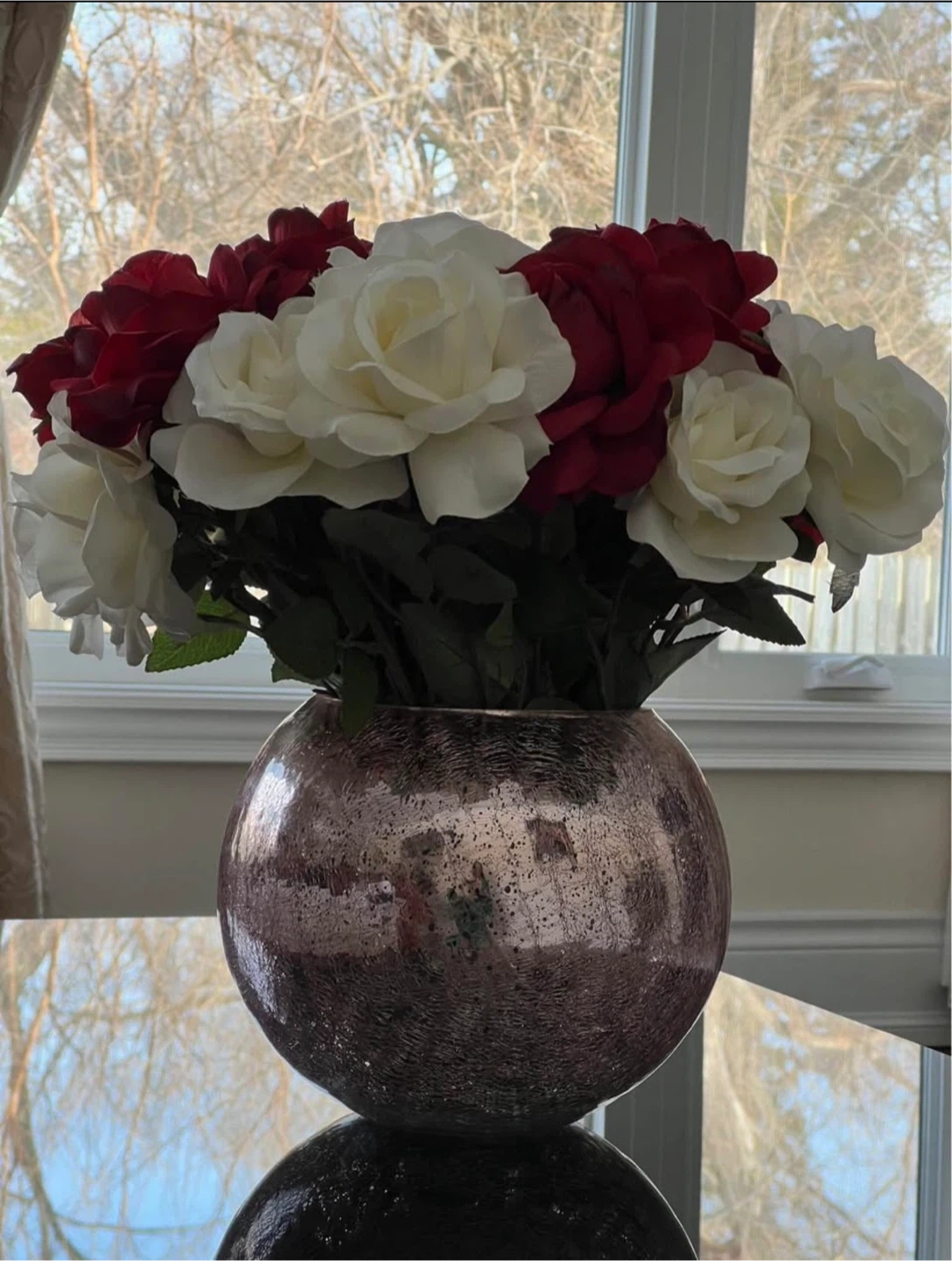 A lovely artificial bouquet featuring red and white roses arranged in a decorative rose gold vase. It's a great accent piece for any room!