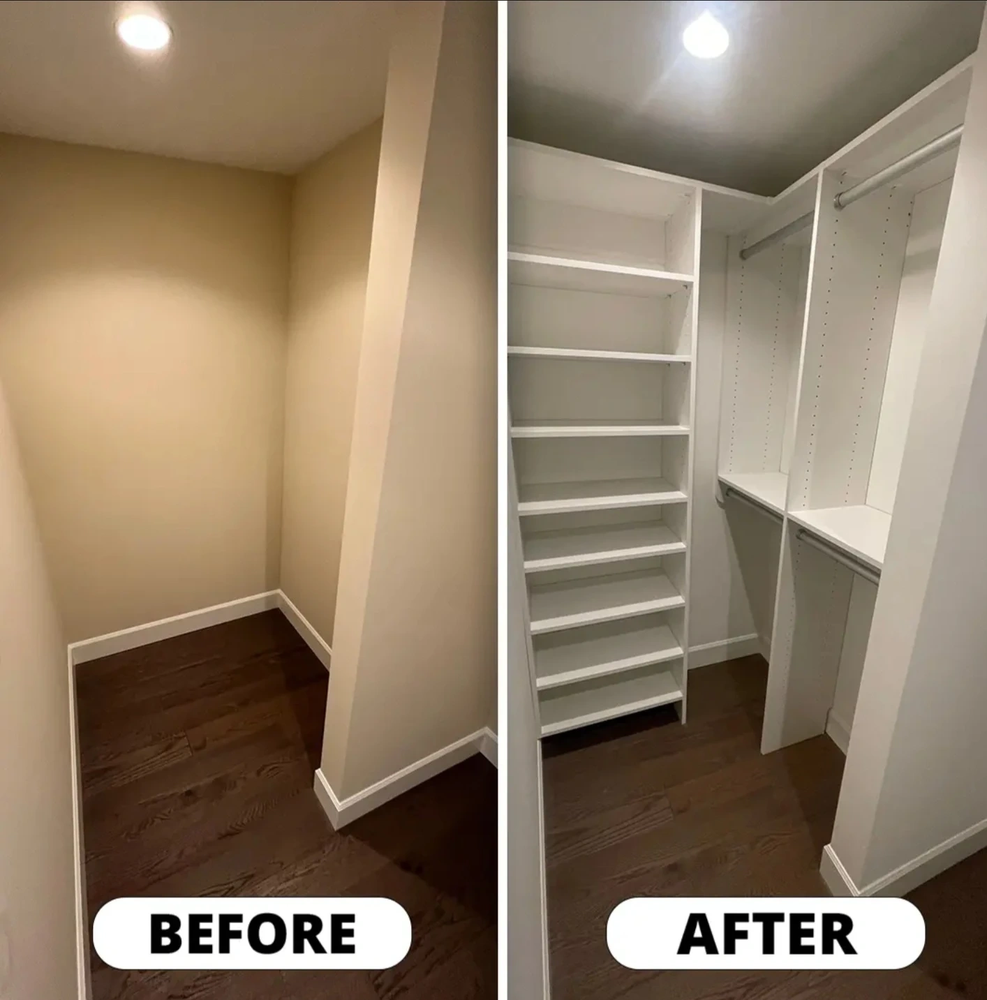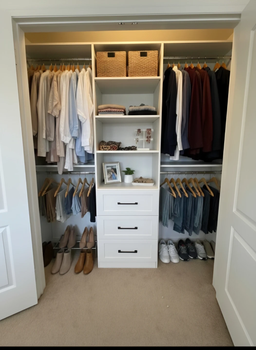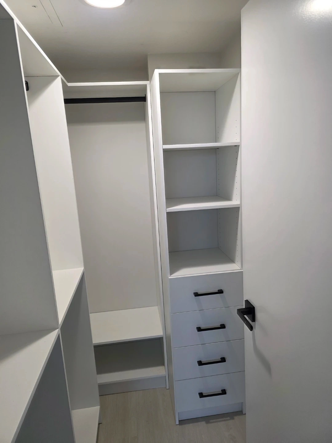 This is a white closet organization system. It includes multiple shelves and drawers for storage. It's a great way to maximize your closet space!