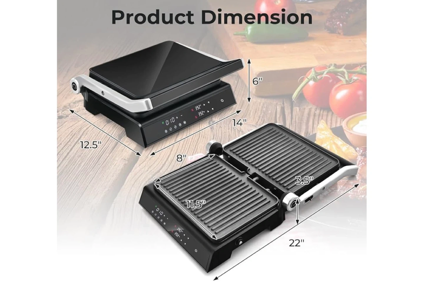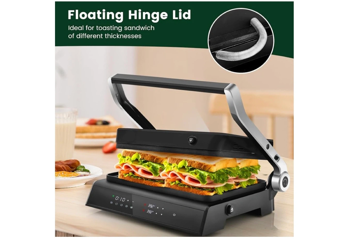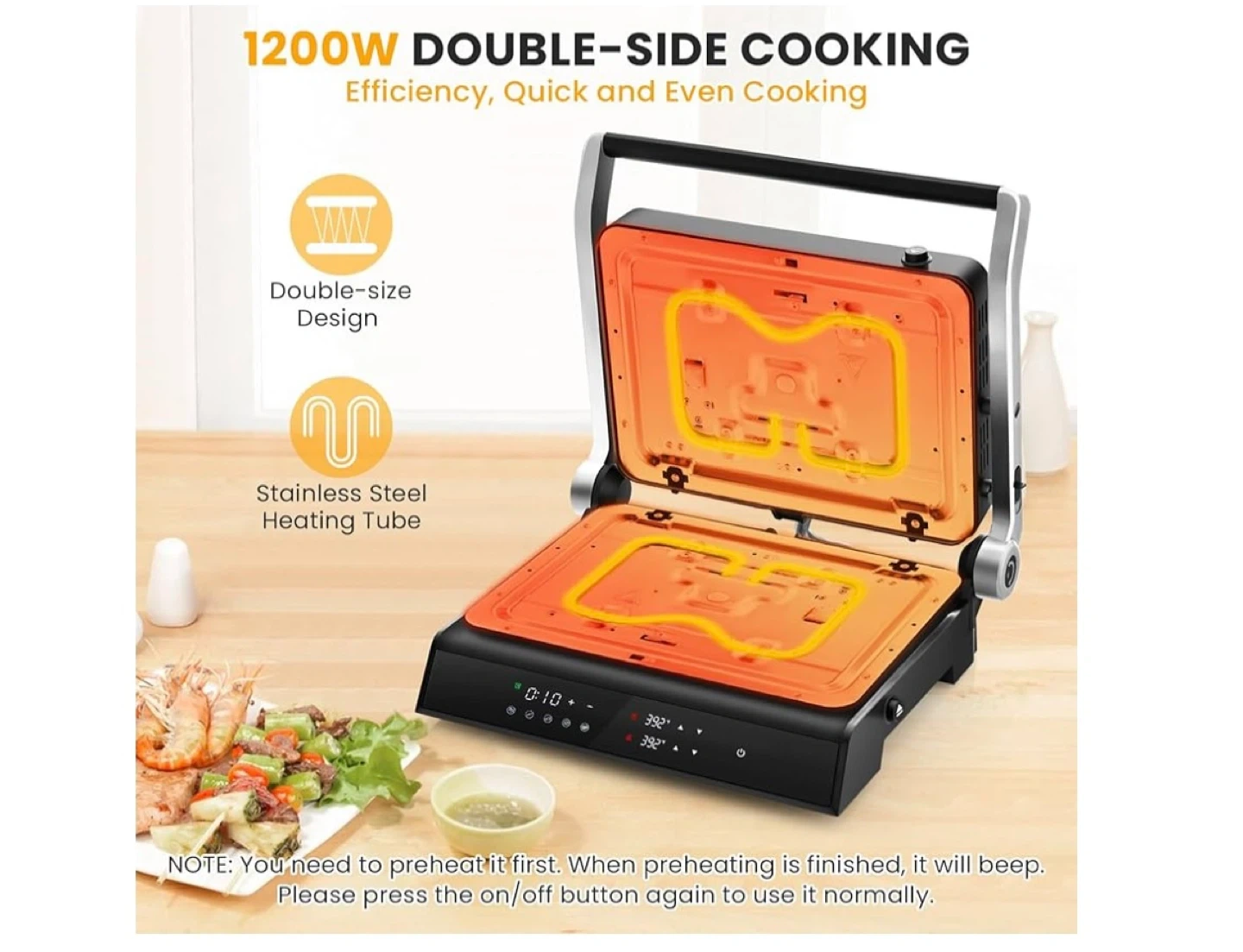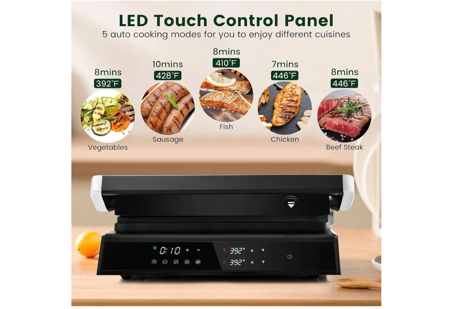 This 3-in-1 electric grill offers contact grill, panini press, and double grill functions. It features a floating hinge lid, detachable non-stick plates, and a dishwasher-safe design for easy cleanup. The LED touch control panel has 5 auto cooking modes for vegetables, sausage, fish, chicken, and beef steak.