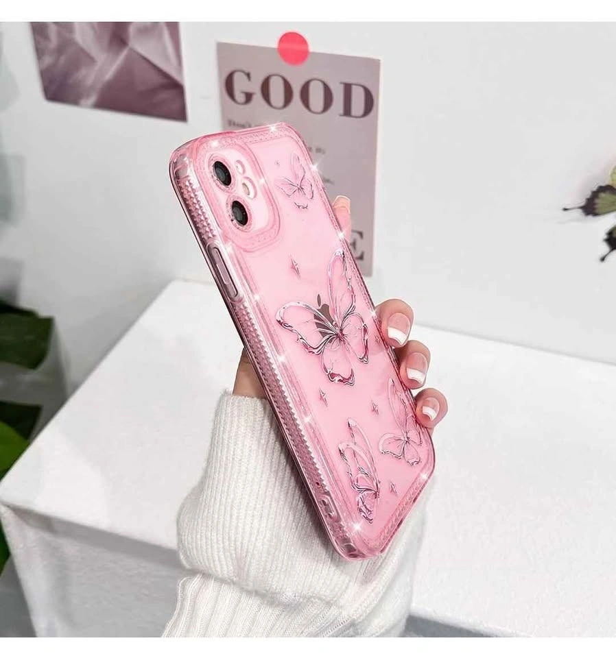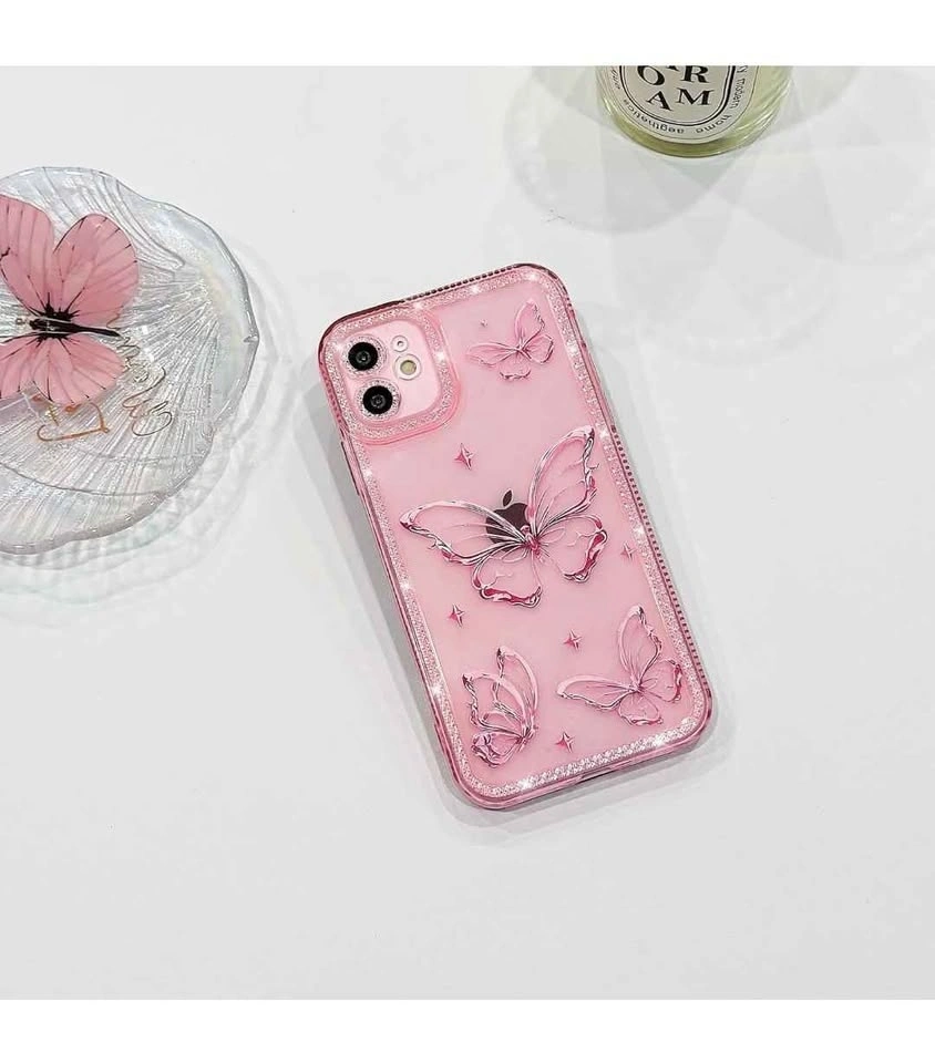 Cute clear case for iPhone 11 with a glitter butterfly design and shiny stars. Sparkly bling with diamond rhinestones. Soft TPU material provides shockproof protection. Pink color.