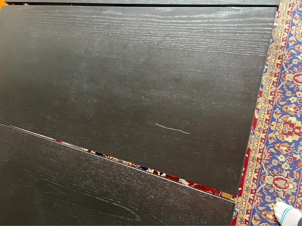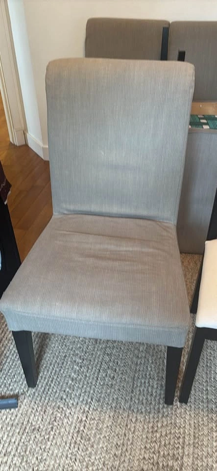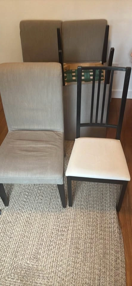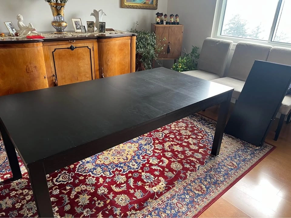 IKEA Extendable Dining Table – Black-Brown. With 8 chairs. Grey upholstered chairs also come with white cover. Comes with two removable leaves that store conveniently underneath the tabletop. Easily shifts from a 4-6 person table to seating 8-10 comfortably when fully extended. Well-cared for in a clean home. Shows minor signs of character consistent with normal use, but remains very sturdy and functional. Width: 37 ½" (95 cm), Height: 29 ½" (75 cm), Length (Standard): 69" (175 cm), Length (Extended): Approx. 102 ½" (260 cm) with both leaves added.