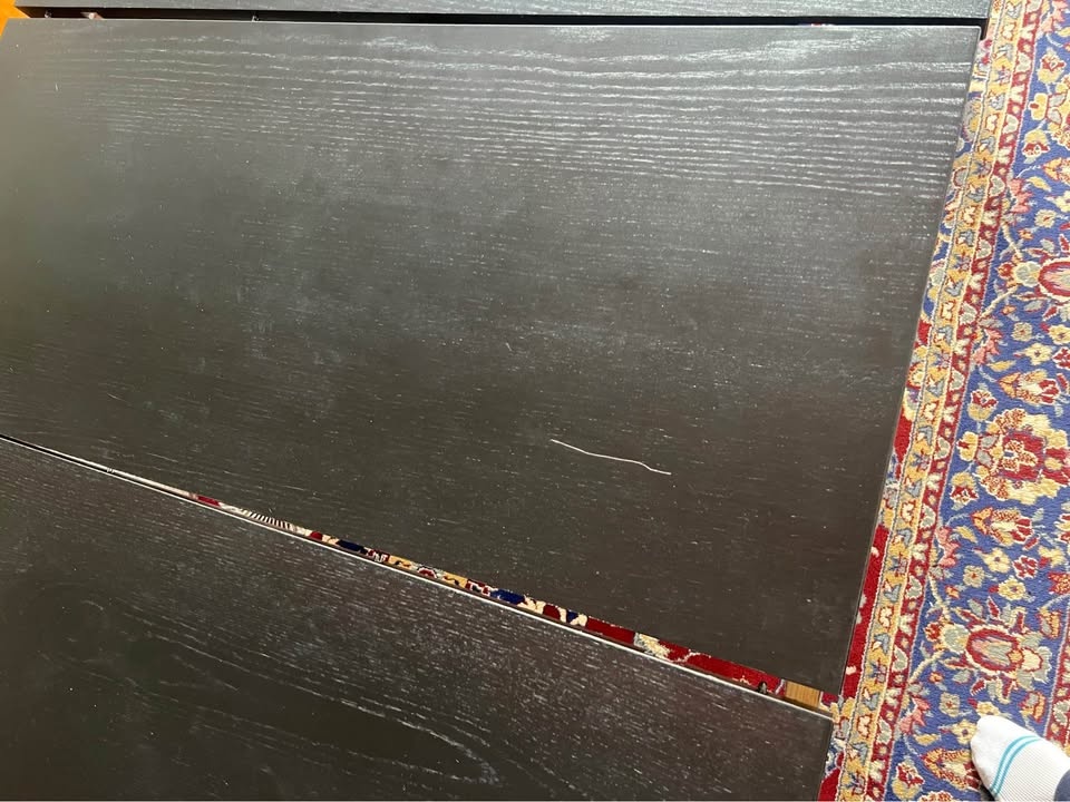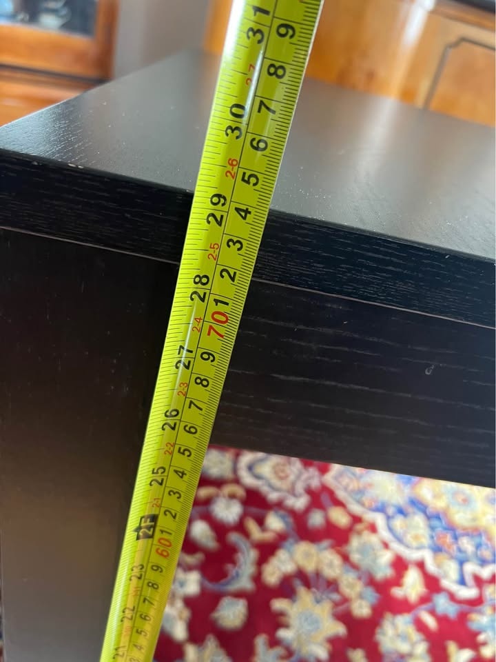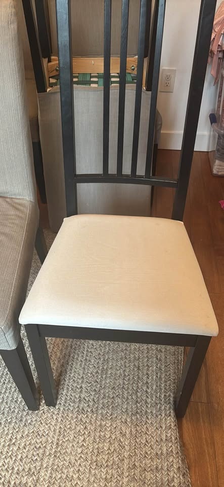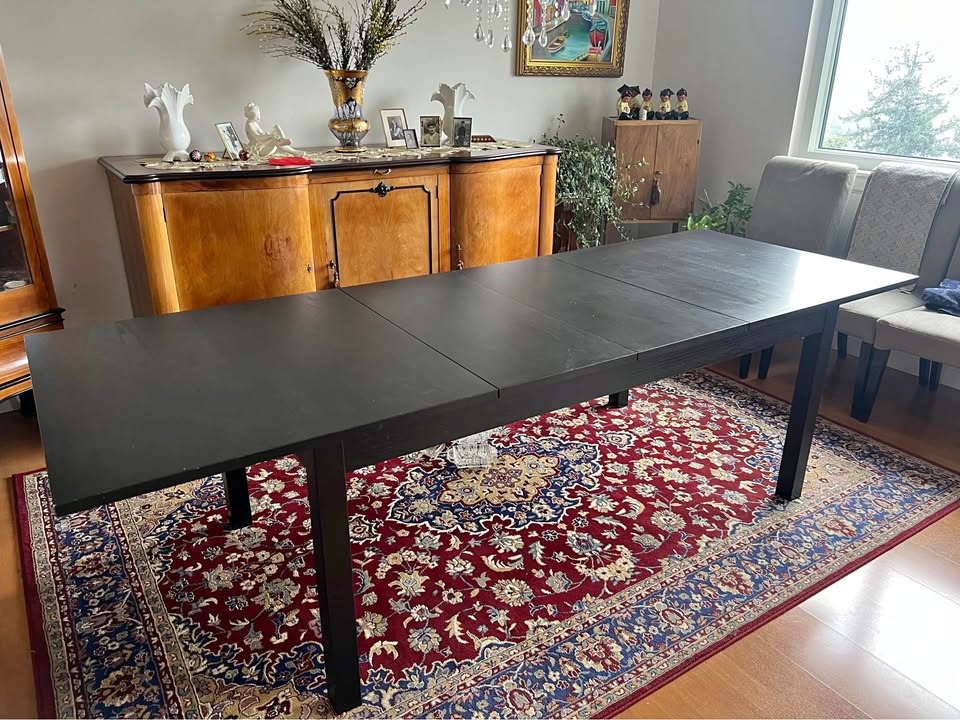 IKEA Extendable Dining Table – Black-Brown. With 8 chairs. Grey upholstered chairs also come with white cover. Comes with two removable leaves that store conveniently underneath the tabletop. Easily shifts from a 4-6 person table to seating 8-10 comfortably when fully extended. Well-cared for in a clean home. Shows minor signs of character consistent with normal use, but remains very sturdy and functional. Width: 37 ½" (95 cm), Height: 29 ½" (75 cm), Length (Standard): 69" (175 cm), Length (Extended): Approx. 102 ½" (260 cm) with both leaves added.
