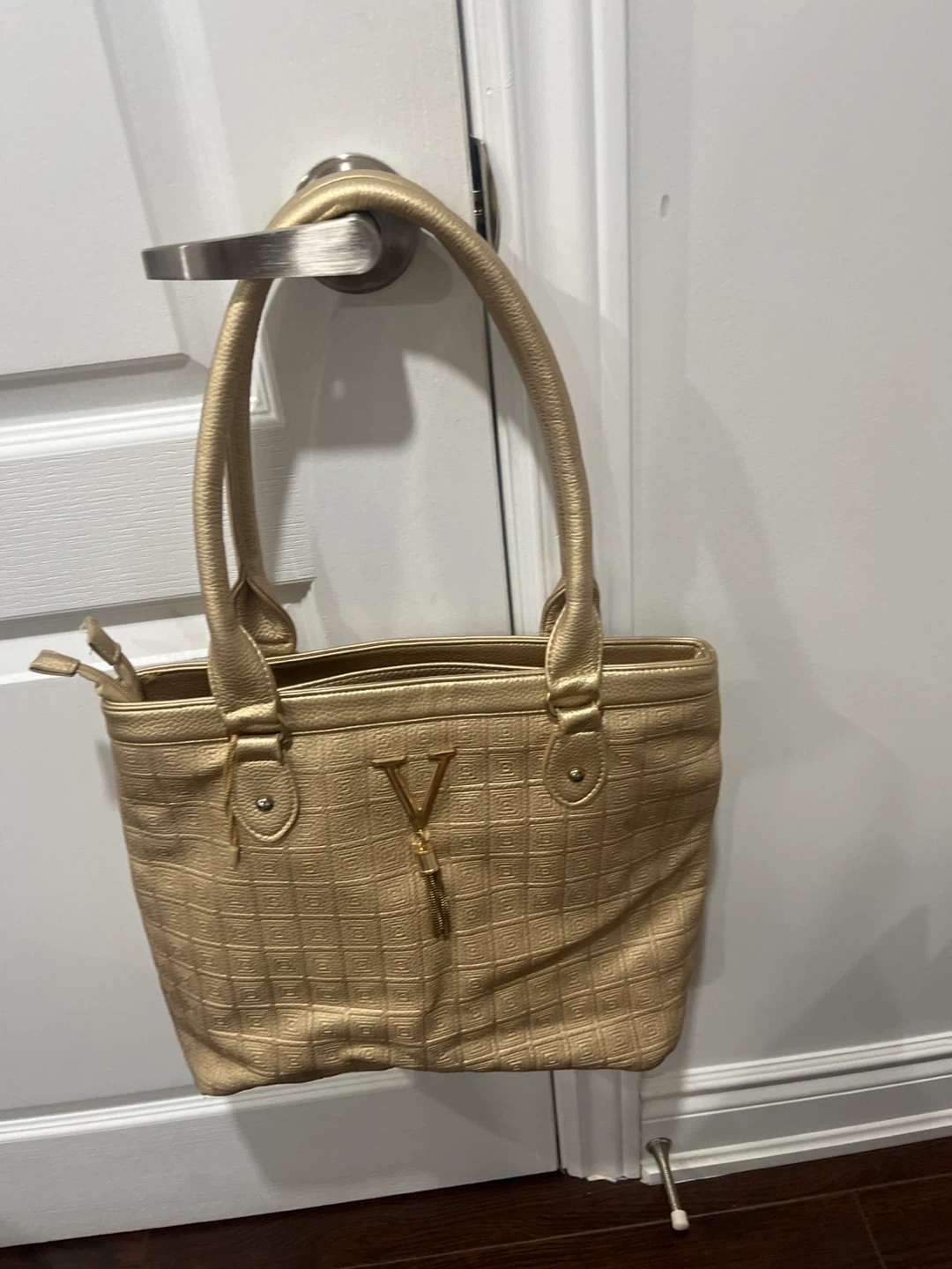 Selling a lovely gold handbag! It features a unique 'V' detail and a stylish quilted pattern. Perfect for adding a touch of elegance to any outfit