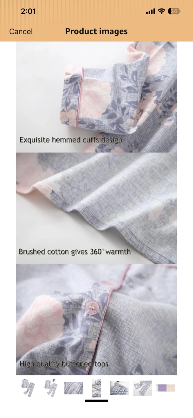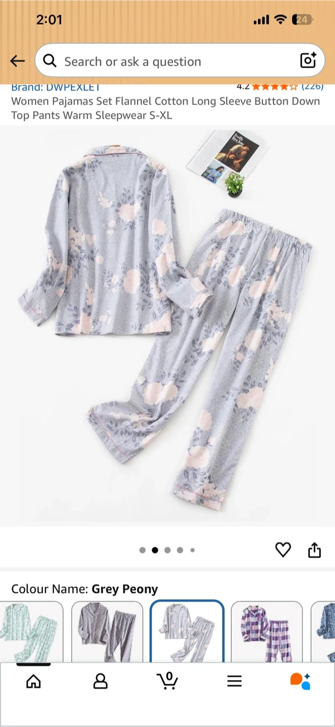Comfy brushed cotton flannel pajama set in a grey peony print. Features a high-quality button-down top with hemmed cuffs and drawstring waist pants. Perfect for staying warm and cozy!