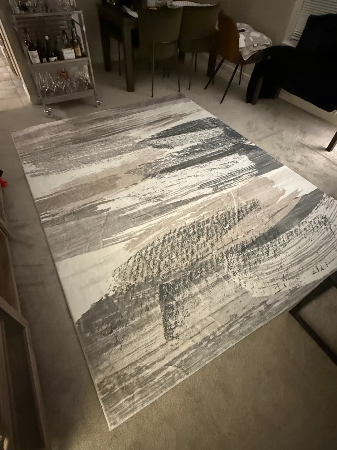 Adds a modern touch to your living space! This area rug features a dynamic abstract brushstroke design in neutral tones. It's made from durable synthetic fibers. Brand new but doesn’t give the vibe I thought it would for my living room!
