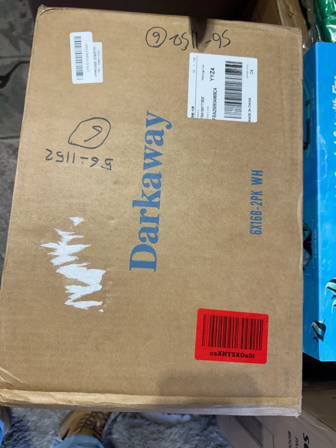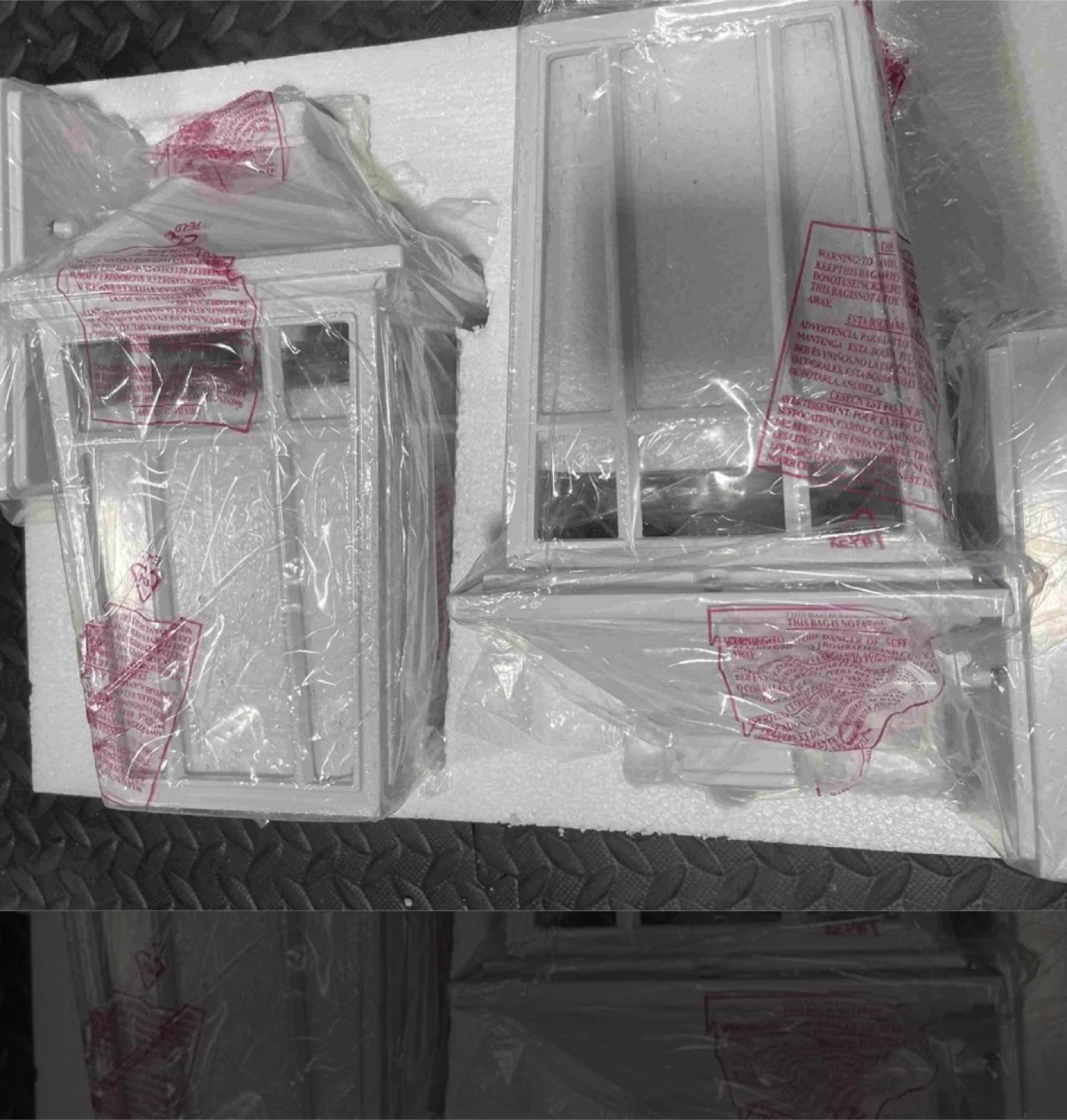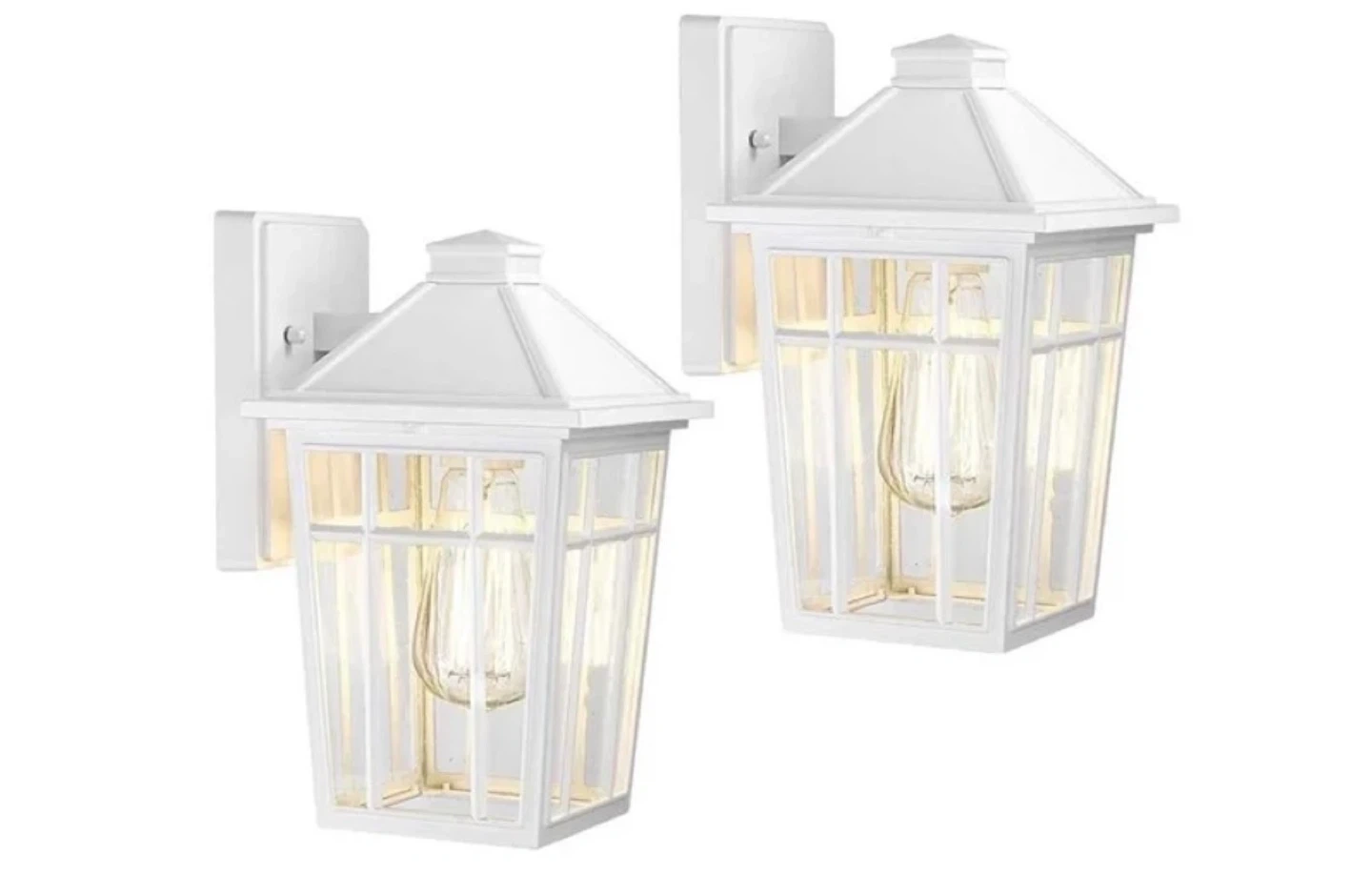 This is a set of two white outdoor wall lights from Darkaway. They're designed in a classic lantern style with clear glass panes. Easy to install for exterior home lighting.
