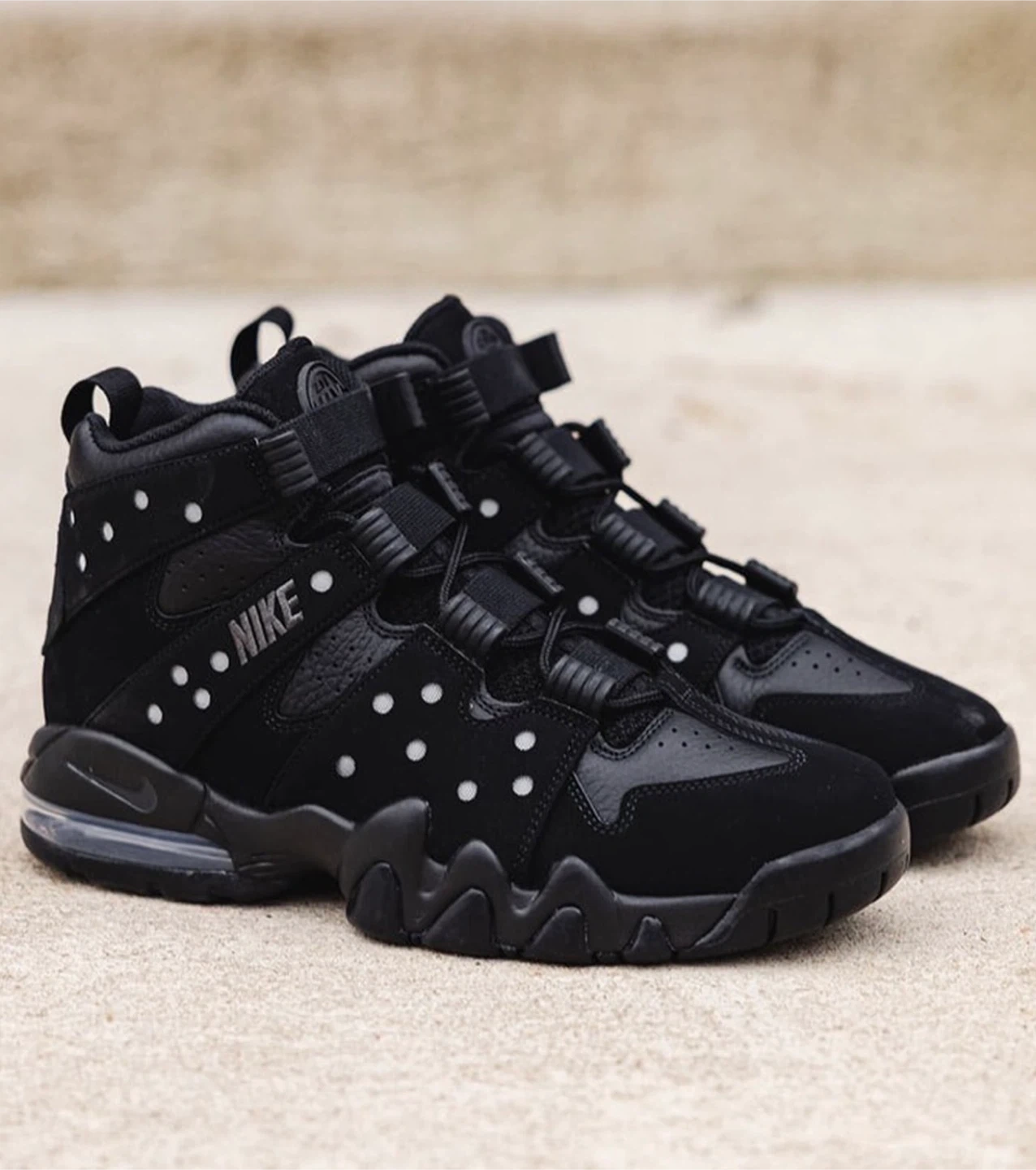 These are black Nike Air Max CB 34 sneakers. They feature a mid-top design with adjustable straps and Air Max cushioning. Made with a combination of leather and suede materials.