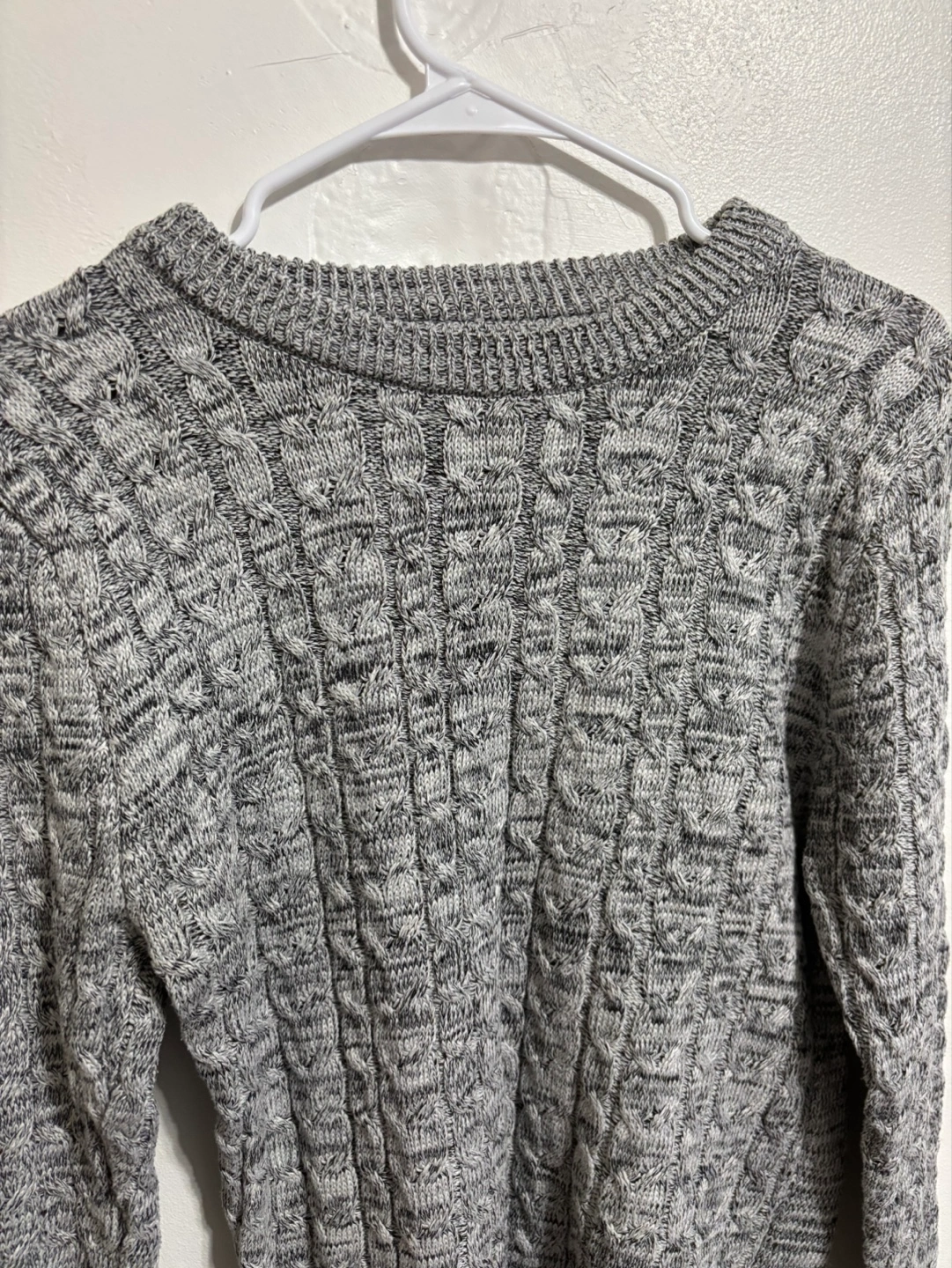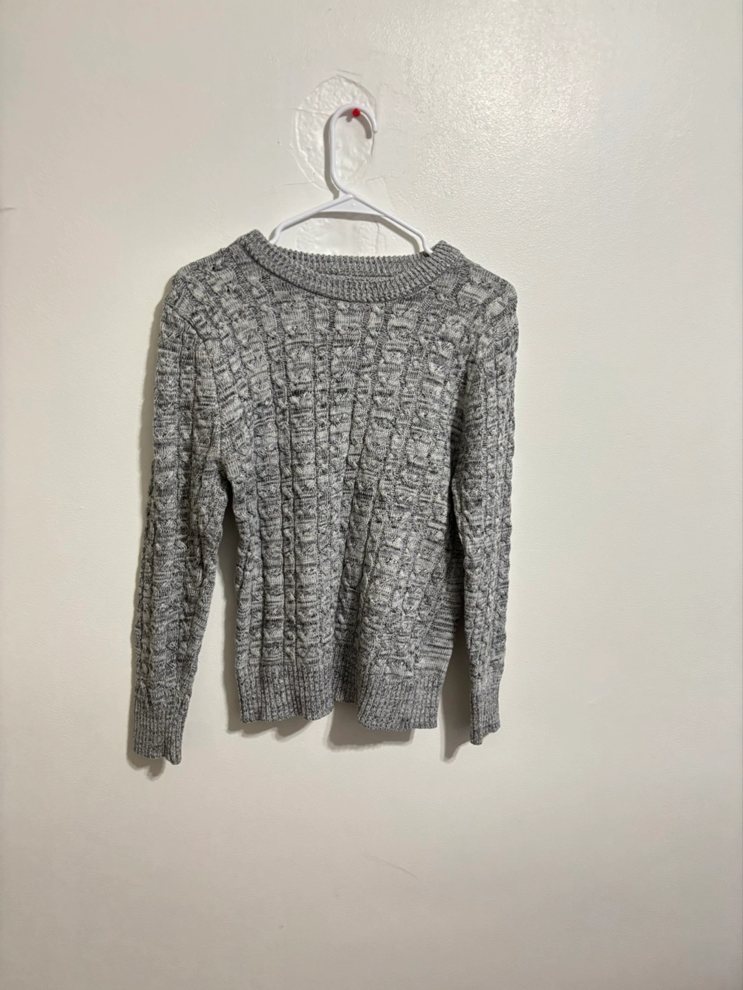 Cozy grey cable knit sweater. Long sleeves, crew neck. Soft material, perfect for fall or winter.