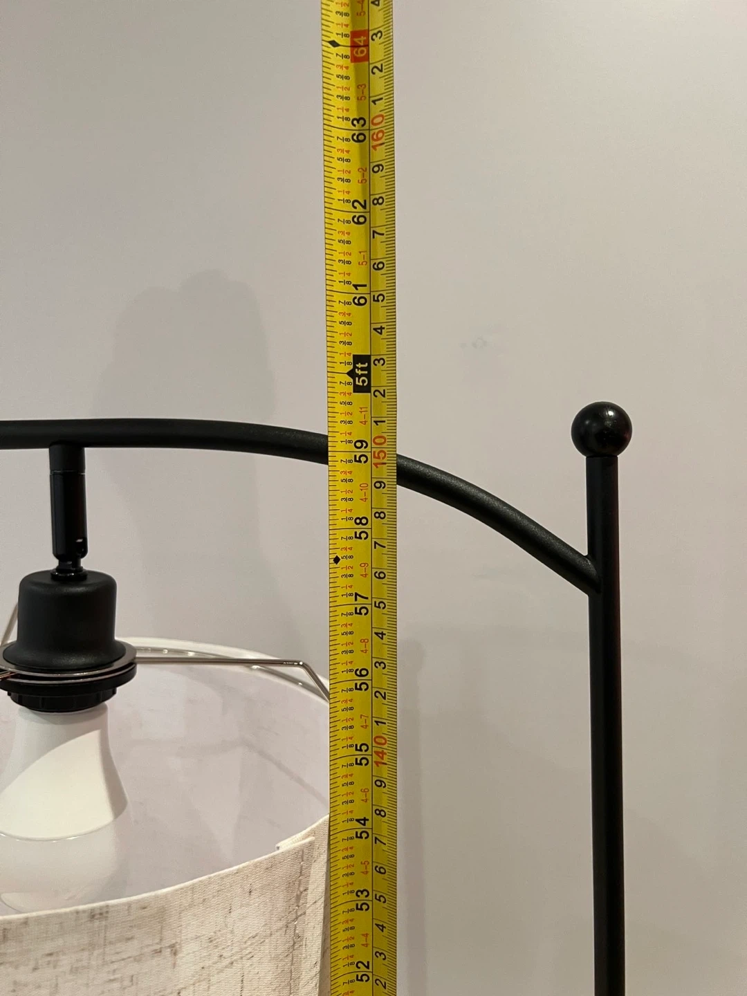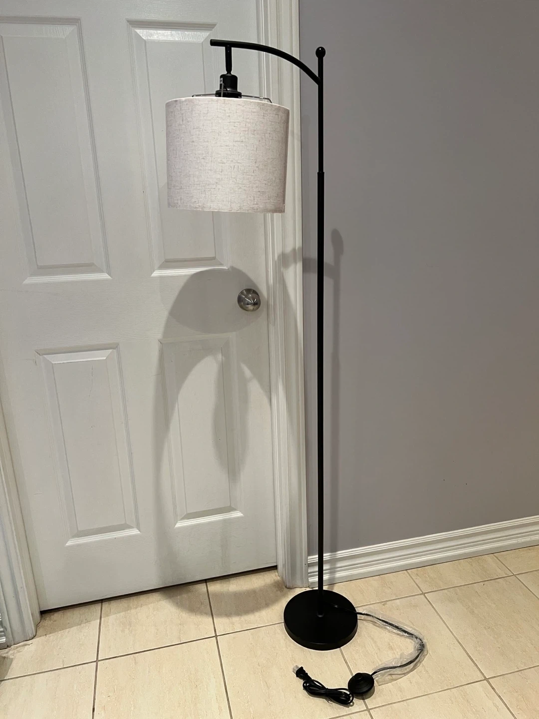 This black arc floor lamp features a textured fabric lampshade. It's a stylish addition to any room, providing ample light. Comes with a standard light bulb and power cord.