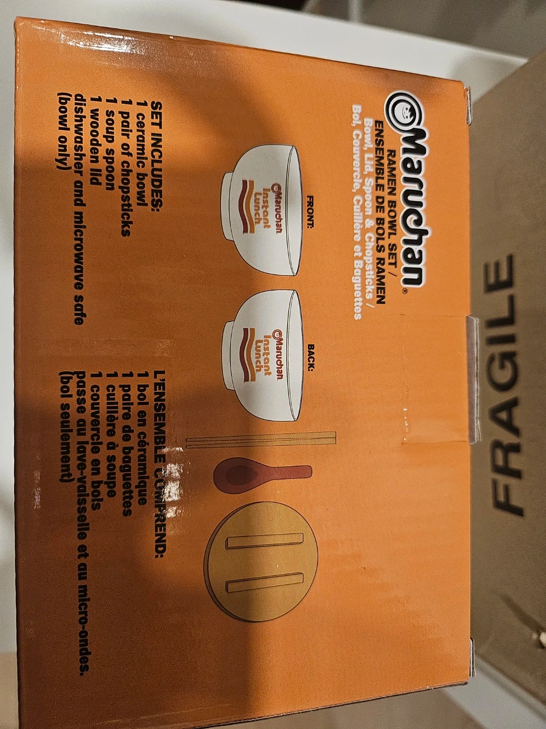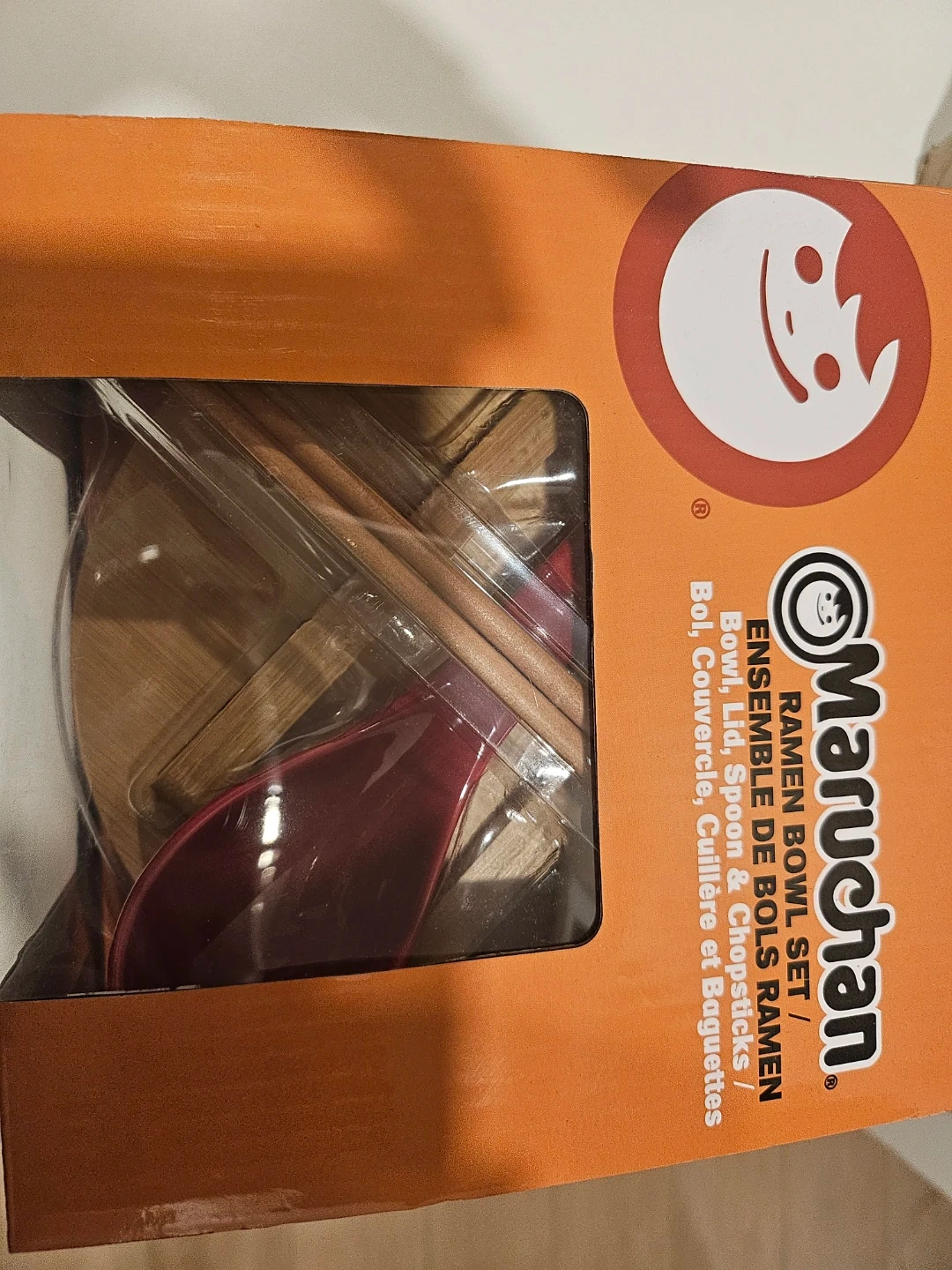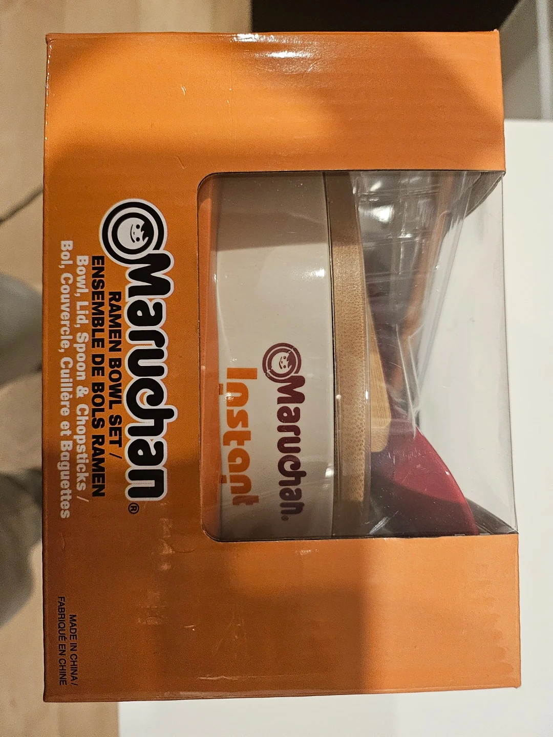I'm selling a brand new Maruchan Ramen Bowl Set still in its original packaging! The set includes a ceramic bowl, a pair of chopsticks, a soup spoon, and a wooden lid. The bowl is both dishwasher and microwave safe, making it super convenient for enjoying your favorite ramen