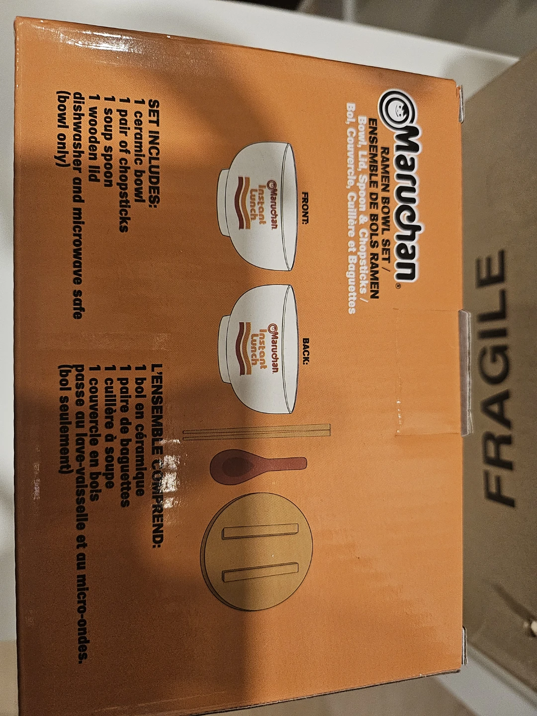 I'm selling a brand new Maruchan Ramen Bowl Set still in its original packaging! The set includes a ceramic bowl, a pair of chopsticks, a soup spoon, and a wooden lid. The bowl is both dishwasher and microwave safe, making it super convenient for enjoying your favorite ramen