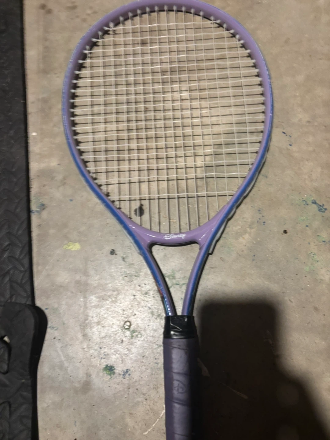 Purple and blue kids' tennis racquet with Disney branding. This racquet is sized for younger players. Comes with a matching purple grip tape.