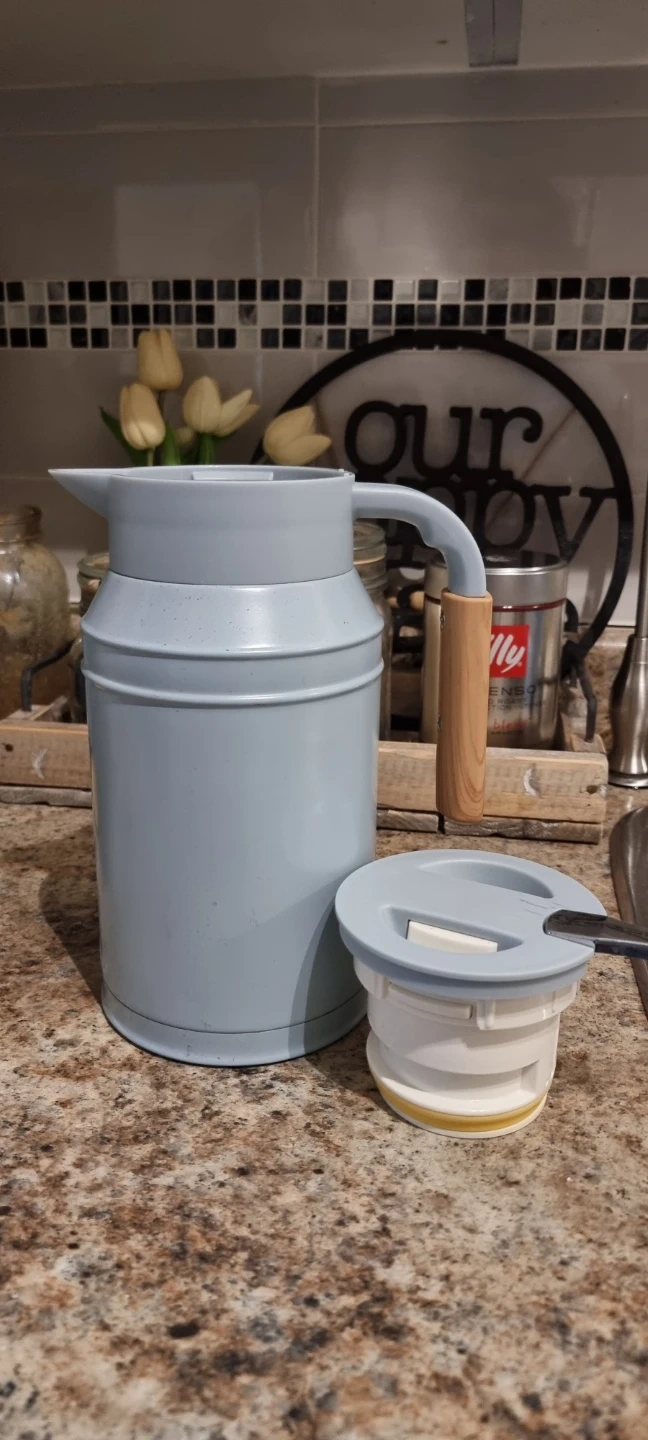 This thermos carafe is light grey with a wooden handle. It's perfect for keeping beverages hot or cold. The lid has a push-button release for easy pouring.