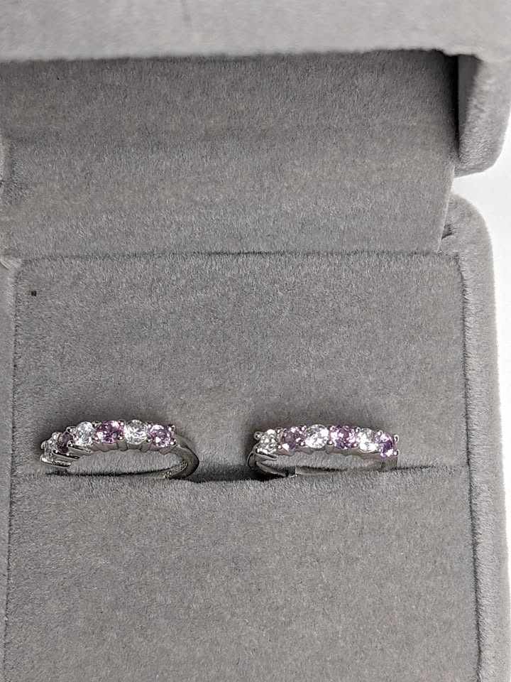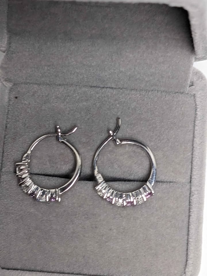Brand new 925 sterling silver rhodium-plated hoop earrings featuring alternating simulated alexandrite and genuine white topaz stones totaling 2.64g. The alexandrite mimics the rare color-shifting effect—green in daylight, purplish under incandescent light—while the natural white topaz adds crisp brilliance and contrast. Approximate length: 0 inches (~Size 0). A striking option for collectors or gift buyers seeking dynamic sparkle and elegant symmetry. Public pick up in Seba Beach Drayton Valley or Spruce Grove Alberta.