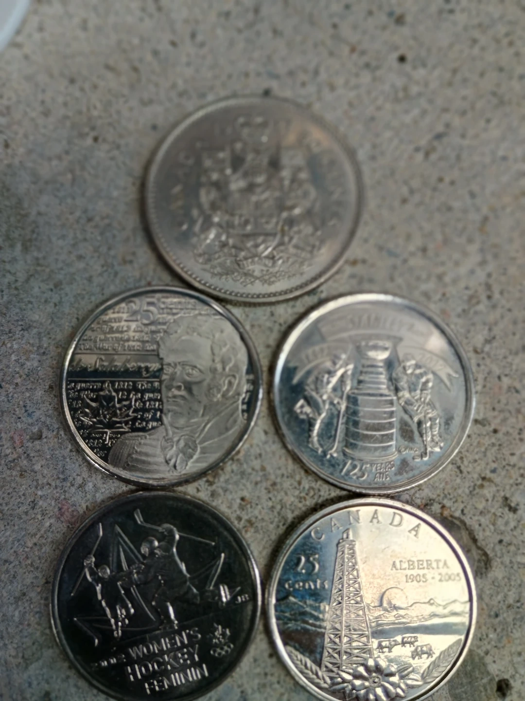 Includes a 1989 25-cent Women's Hockey coin, a 2005 Alberta 25-cent coin, and three other assorted commemorative coins. These coins showcase Canadian history and achievements.