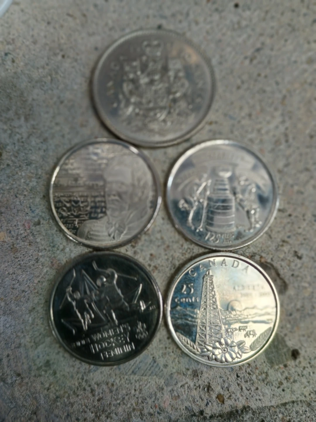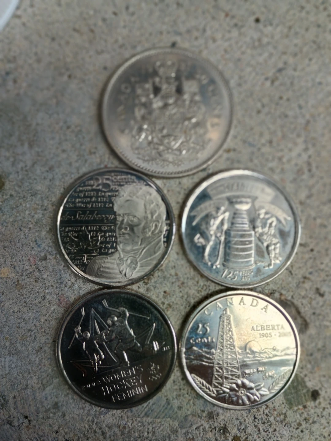 Includes a 1989 25-cent Women's Hockey coin, a 2005 Alberta 25-cent coin, and three other assorted commemorative coins. These coins showcase Canadian history and achievements.