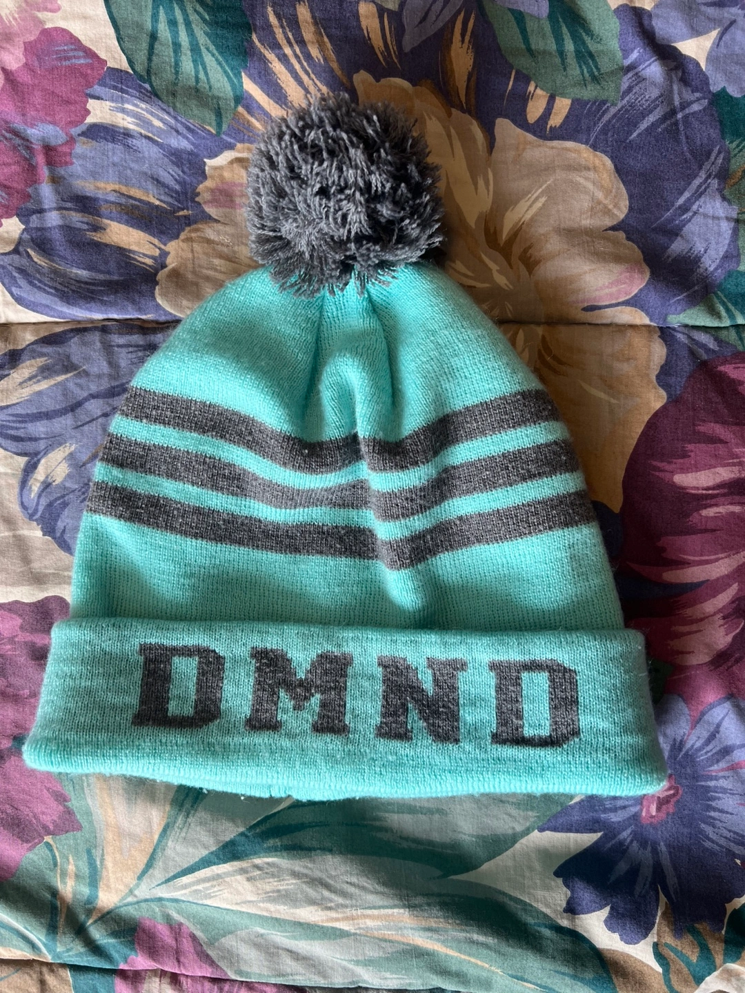 Mint green beanie with grey stripes and pompom. Features Diamond Supply Co. branding. Soft knit material.