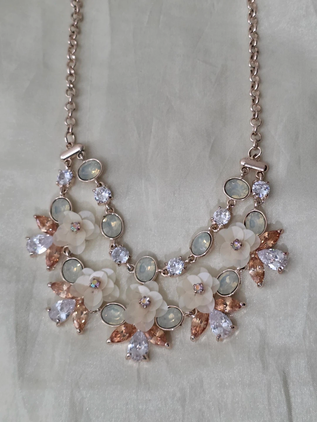 This rose gold-tone statement necklace features a floral design with faux pearls and sparkling crystals. It's a lovely piece for adding a touch of elegance to any outfit. The necklace has a secure clasp closure.