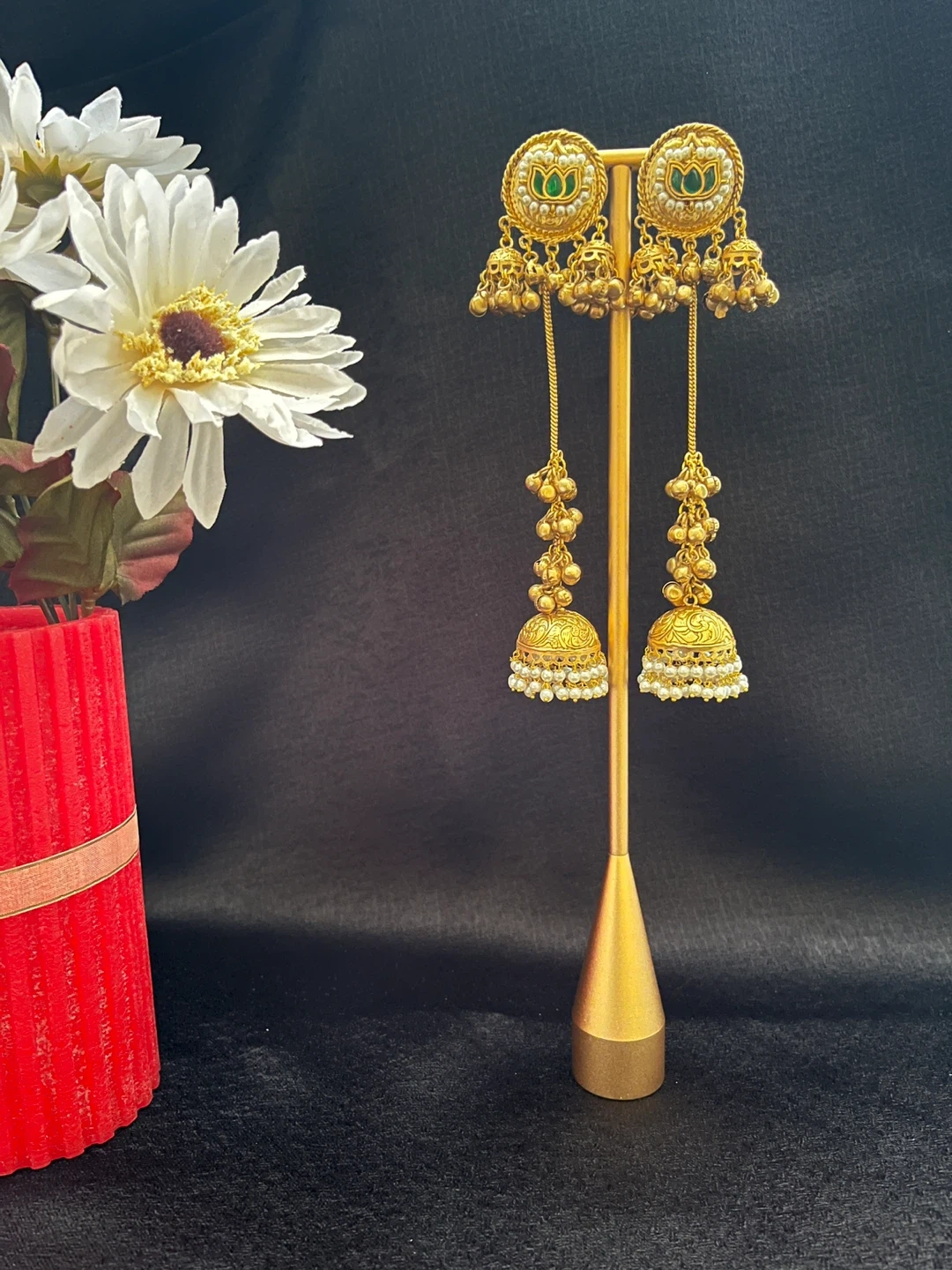 These ornate gold jhumka earrings feature intricate detailing and dangling faux pearls. The top of the earrings have a circular design with a lotus motif and green accents. They hang from chains adorned with small golden beads, ending in bell-shaped jhumkas. Perfect for adding a touch of elegance to traditional outfits!
