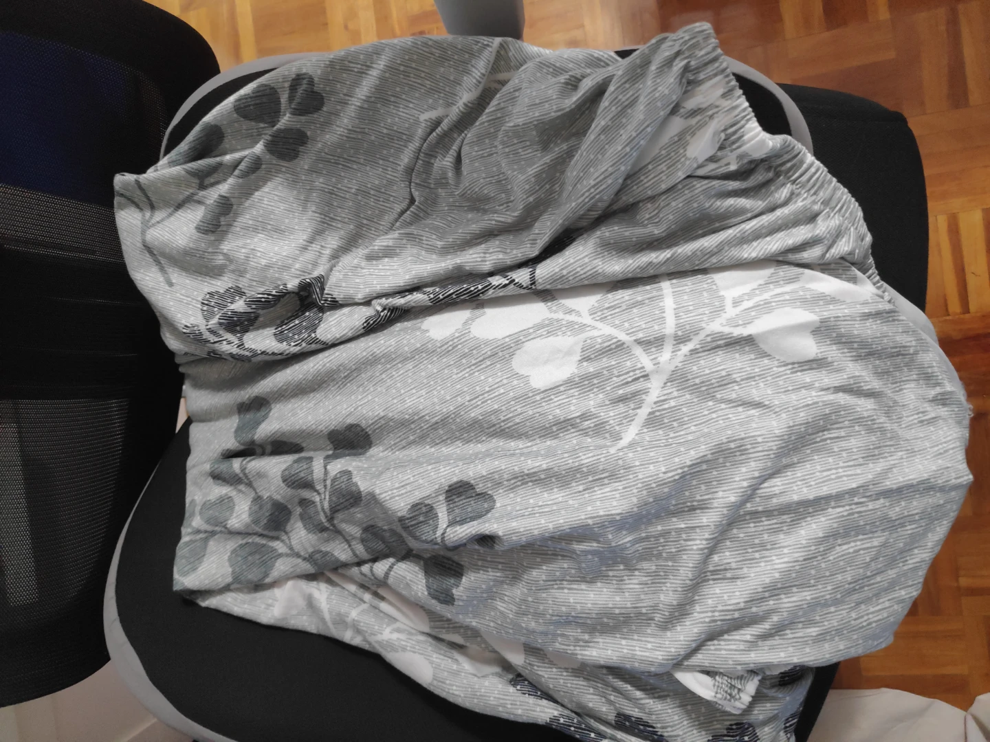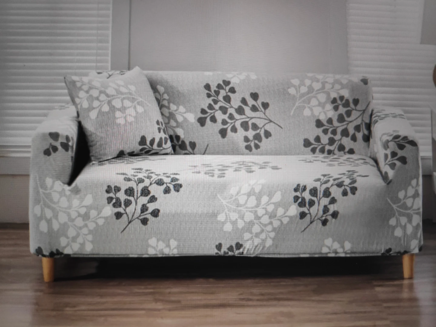 Sofa Cover for a two-seater couch. It's made of stretchy spandex material in a grey leaves pattern. Fits sofas from 145-185cm.