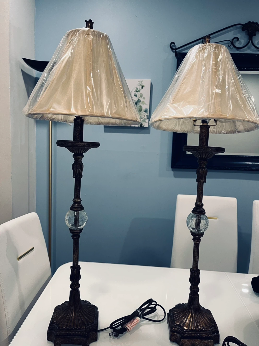 A set of two vintage-inspired table lamps with ornate bases and textured beige lampshades. Each lamp features a decorative glass orb accent on its stem. The lampshades are still in their protective plastic wrap. They'd add a touch of classic elegance to any room!