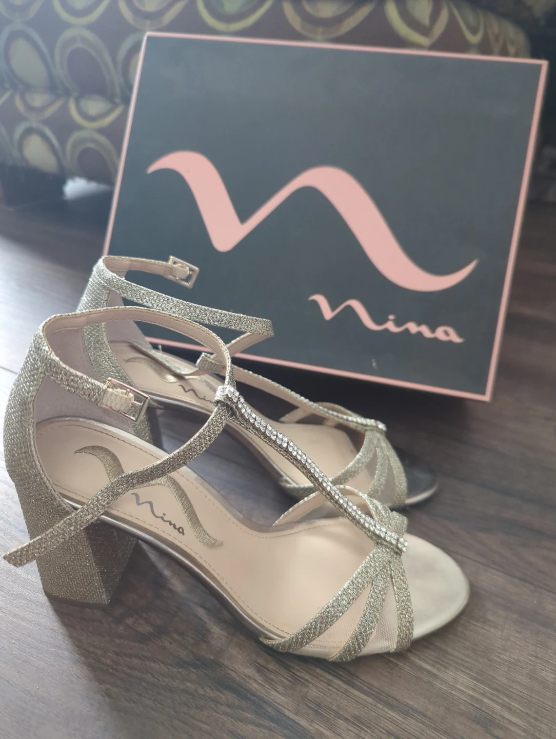 Sparkly silver Nina heels with an ankle strap and t-strap design. They have a glitter finish and rhinestone embellishments. Comes with the original box. Perfect for special occasions!