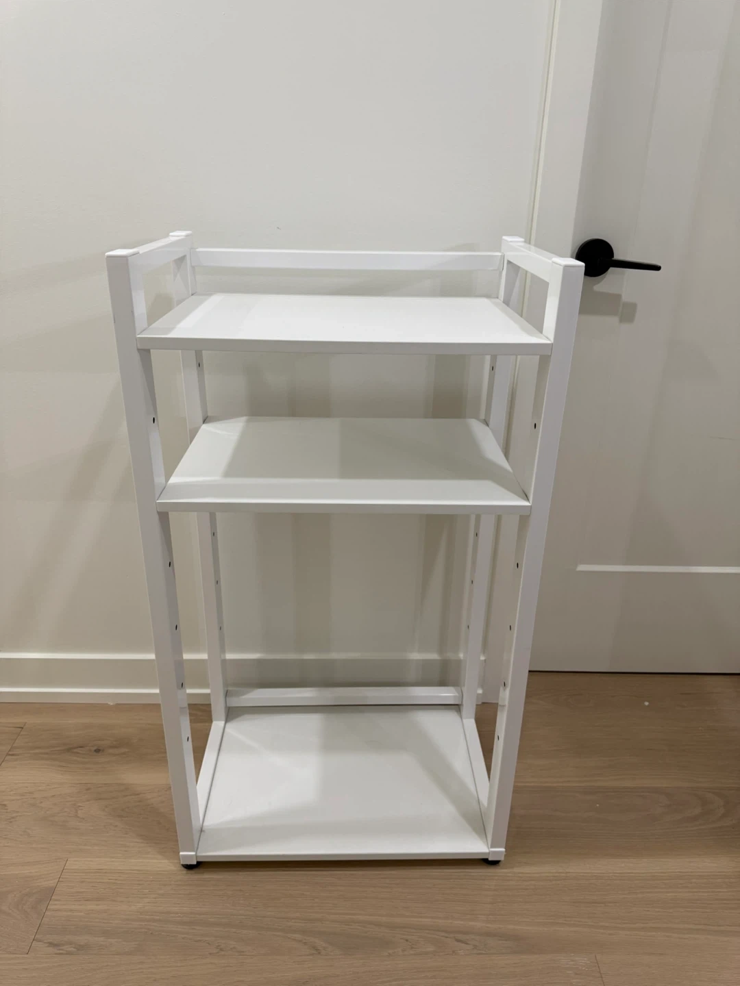 Selling a sturdy, minimalist white 3-tier shelving unit in excellent condition — perfect for bathroom storage, kitchen organization, laundry room, or even as a compact bookcase.