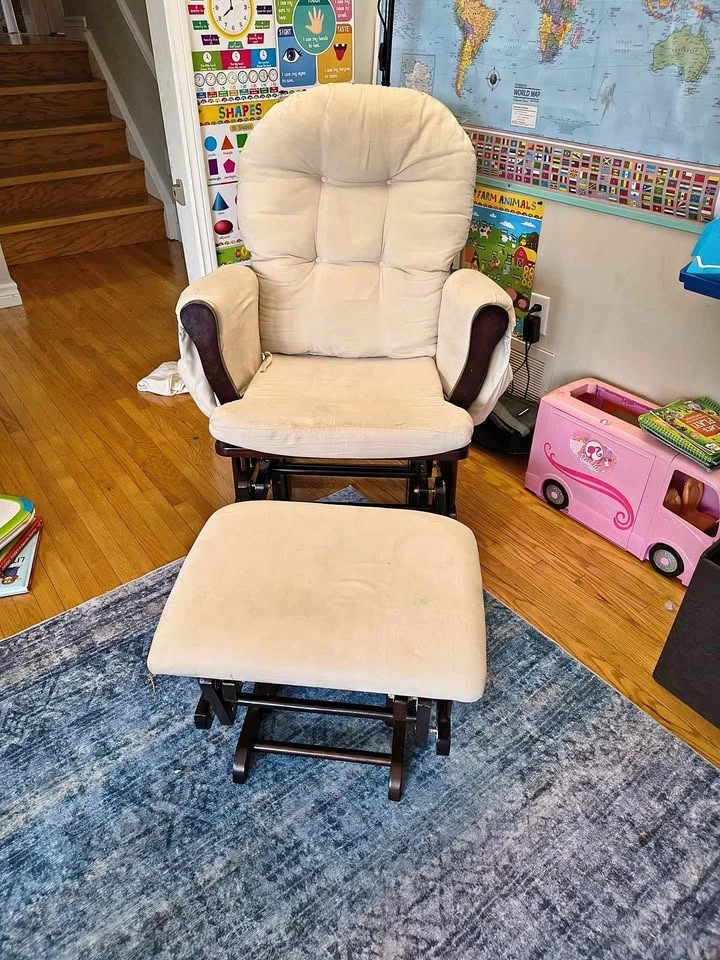 Selling our gliding rocking chair and ottoman. We used this in our nursery. It's in great condition with the exception of a few small marks. All the cushions are removable and washable except the ottoman. Smoke free, pet free home. Pickup Erin (not Mississauga).