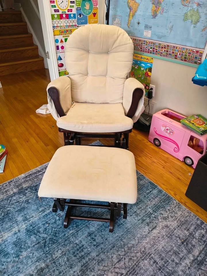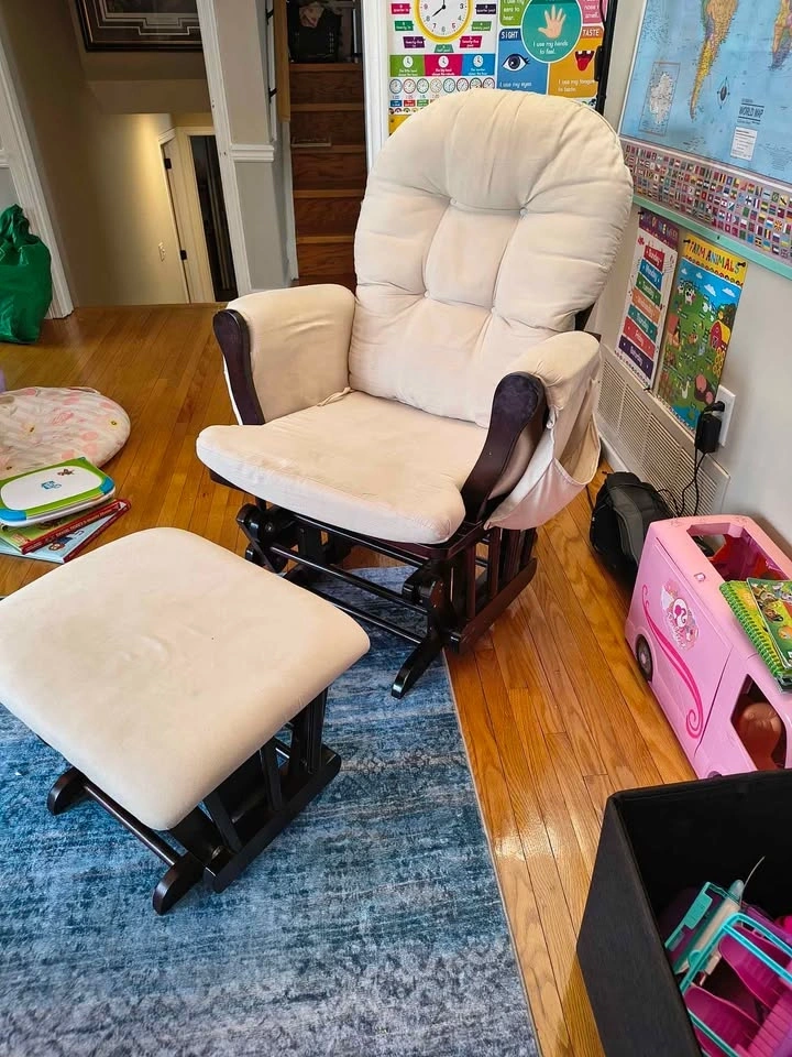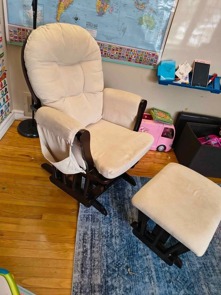Selling our gliding rocking chair and ottoman. We used this in our nursery. It's in great condition with the exception of a few small marks. All the cushions are removable and washable except the ottoman. Smoke free, pet free home. Pickup Erin (not Mississauga).