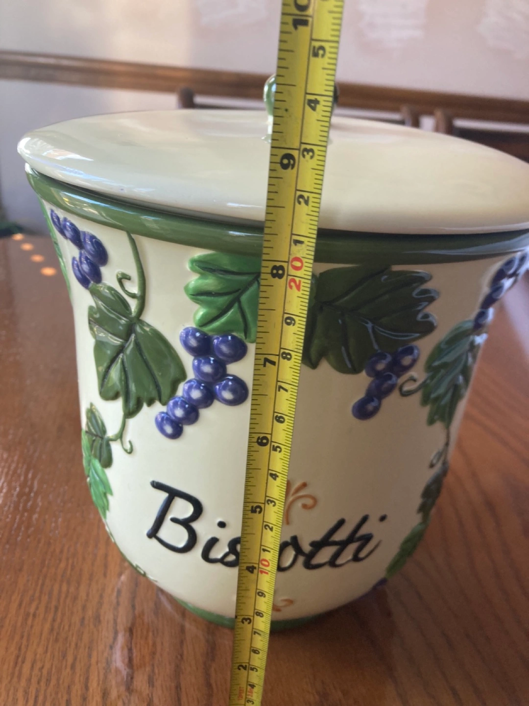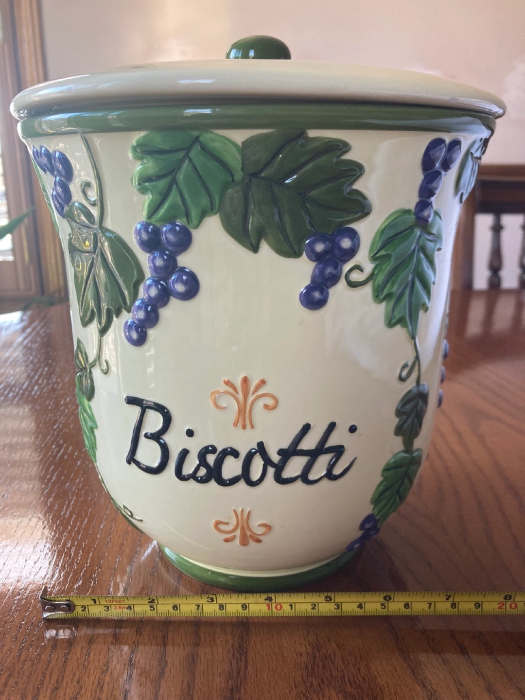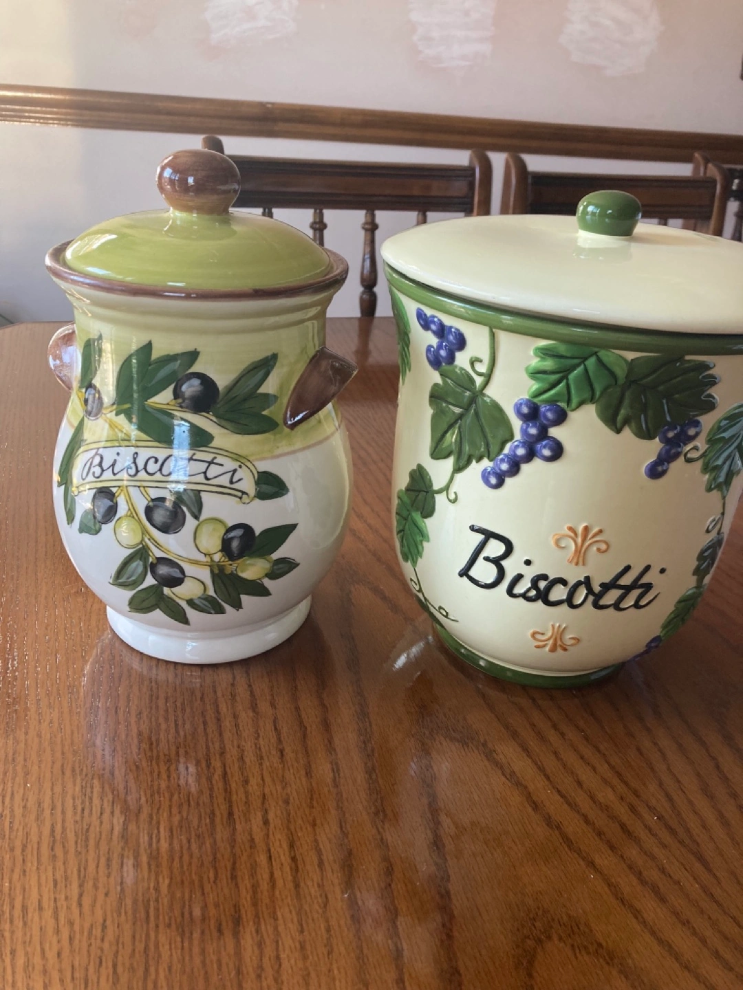Charming ceramic cookie jars Features an olive branch design and the word Biscotti. Approximately 20 cm tall. Perfect for storing cookies or other treats. $20 each both for $30