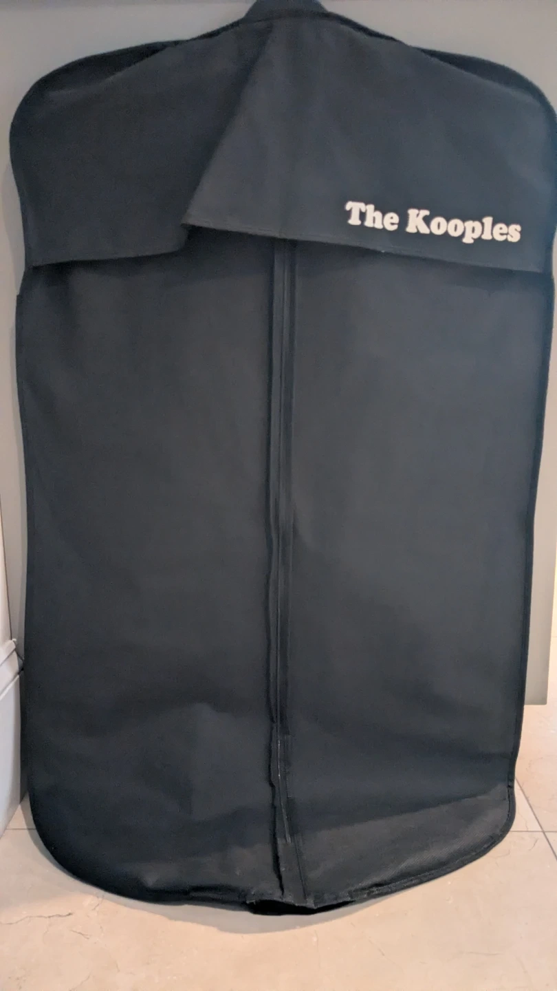 Two garment bags, one branded The Kooples and the other Hudson's Bay. These bags are great for protecting your suits and dresses during travel or storage. They're made of durable material and feature zippers for easy access.