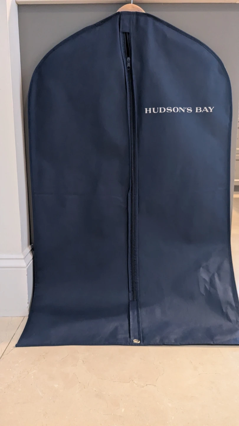 Two garment bags, one branded The Kooples and the other Hudson's Bay. These bags are great for protecting your suits and dresses during travel or storage. They're made of durable material and feature zippers for easy access.