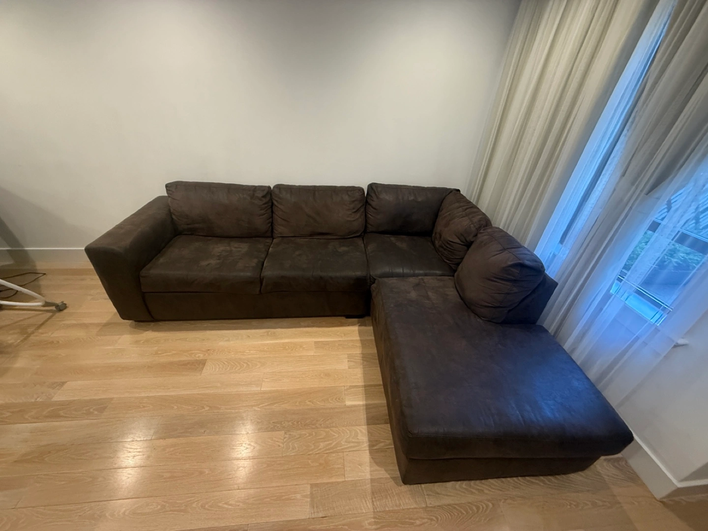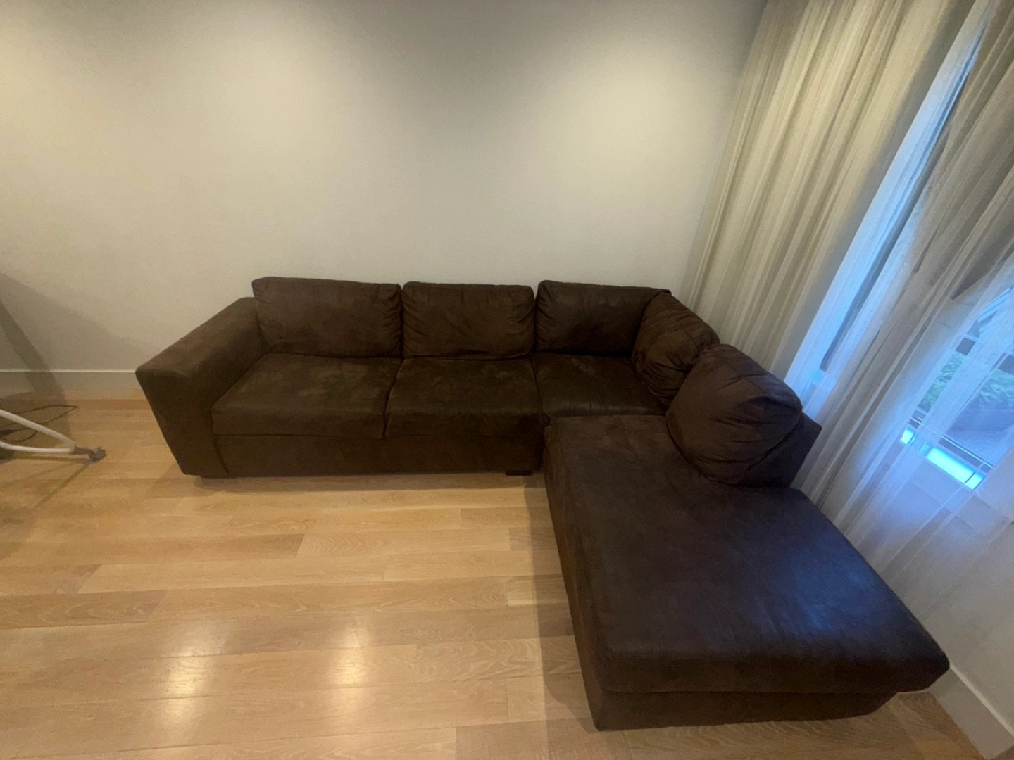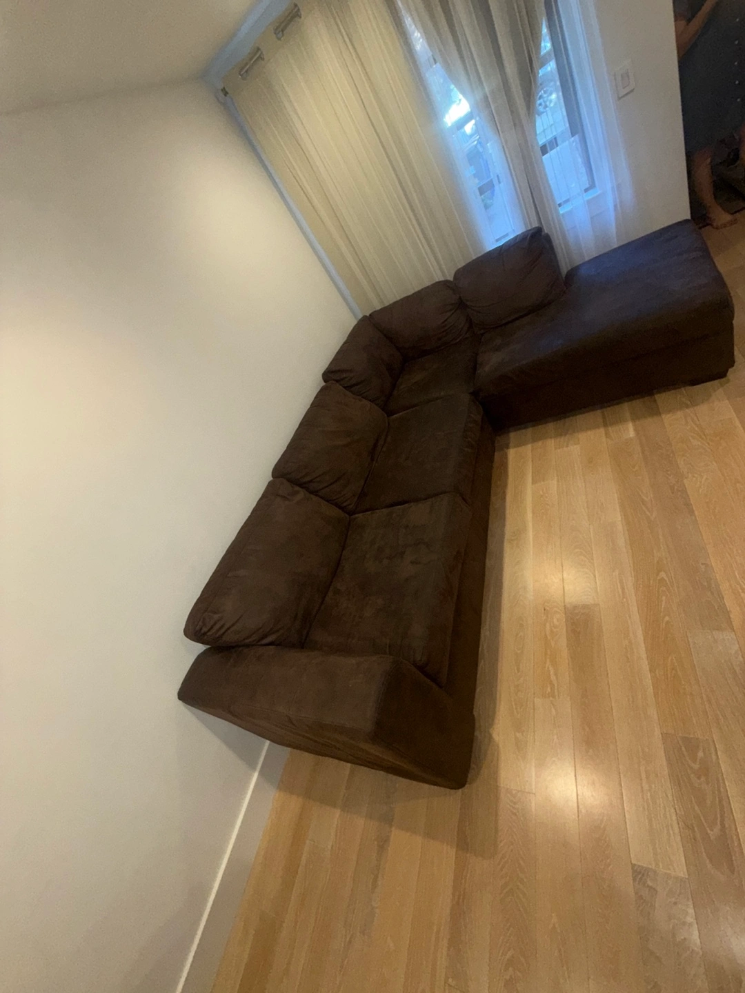 Selling a comfortable brown sectional sofa. It's a great piece for any living room and provides plenty of seating space. The material is soft to the touch and it's in good condition!