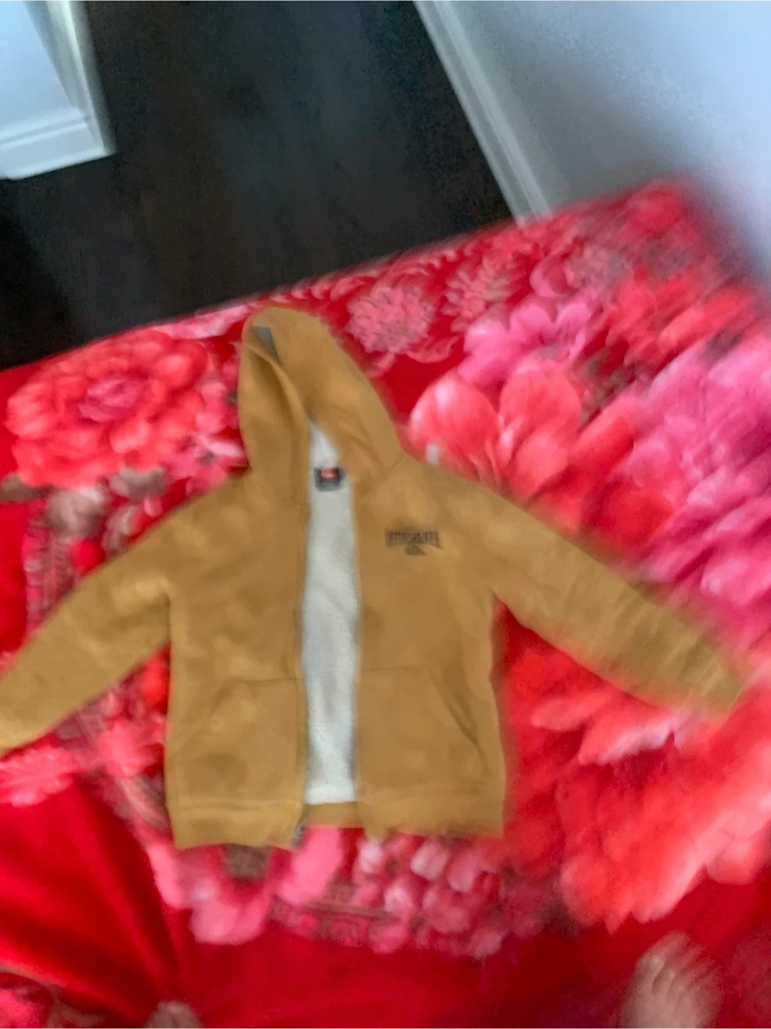 This is a yellow Quiksilver zip-up hoodie for youth. It features a soft sherpa lining inside for extra warmth. The front has a kangaroo pocket.