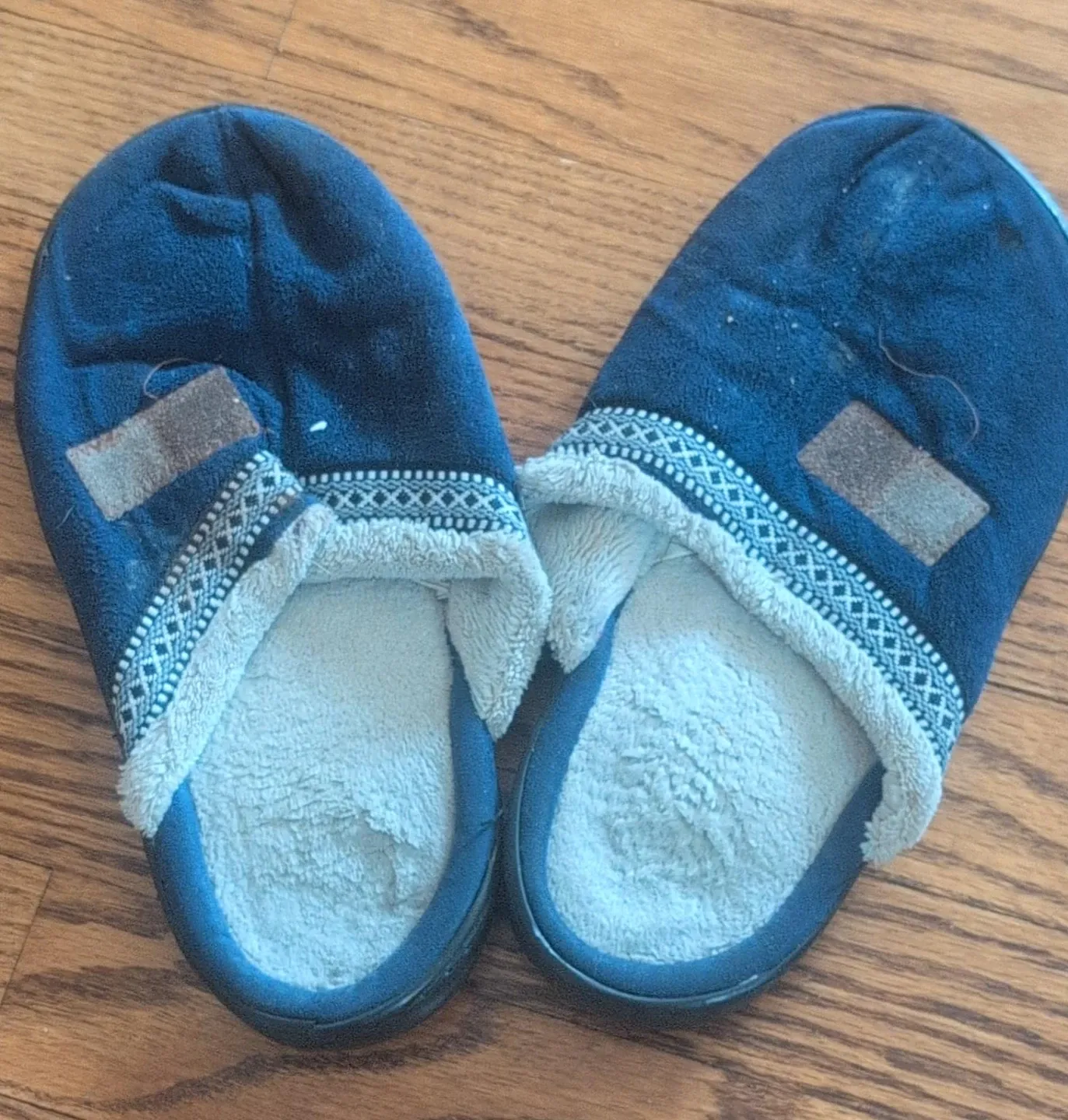Cozy blue fleece-lined slippers with a patterned trim. These house shoes are soft and comfortable. Perfect for keeping your feet warm around the house!