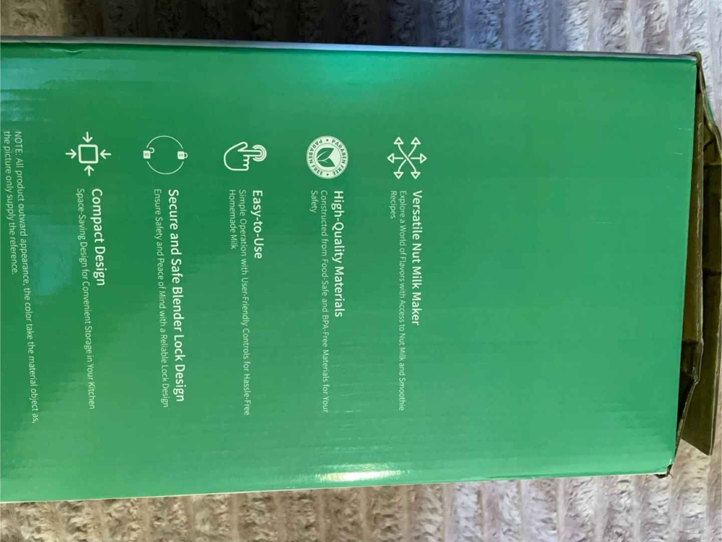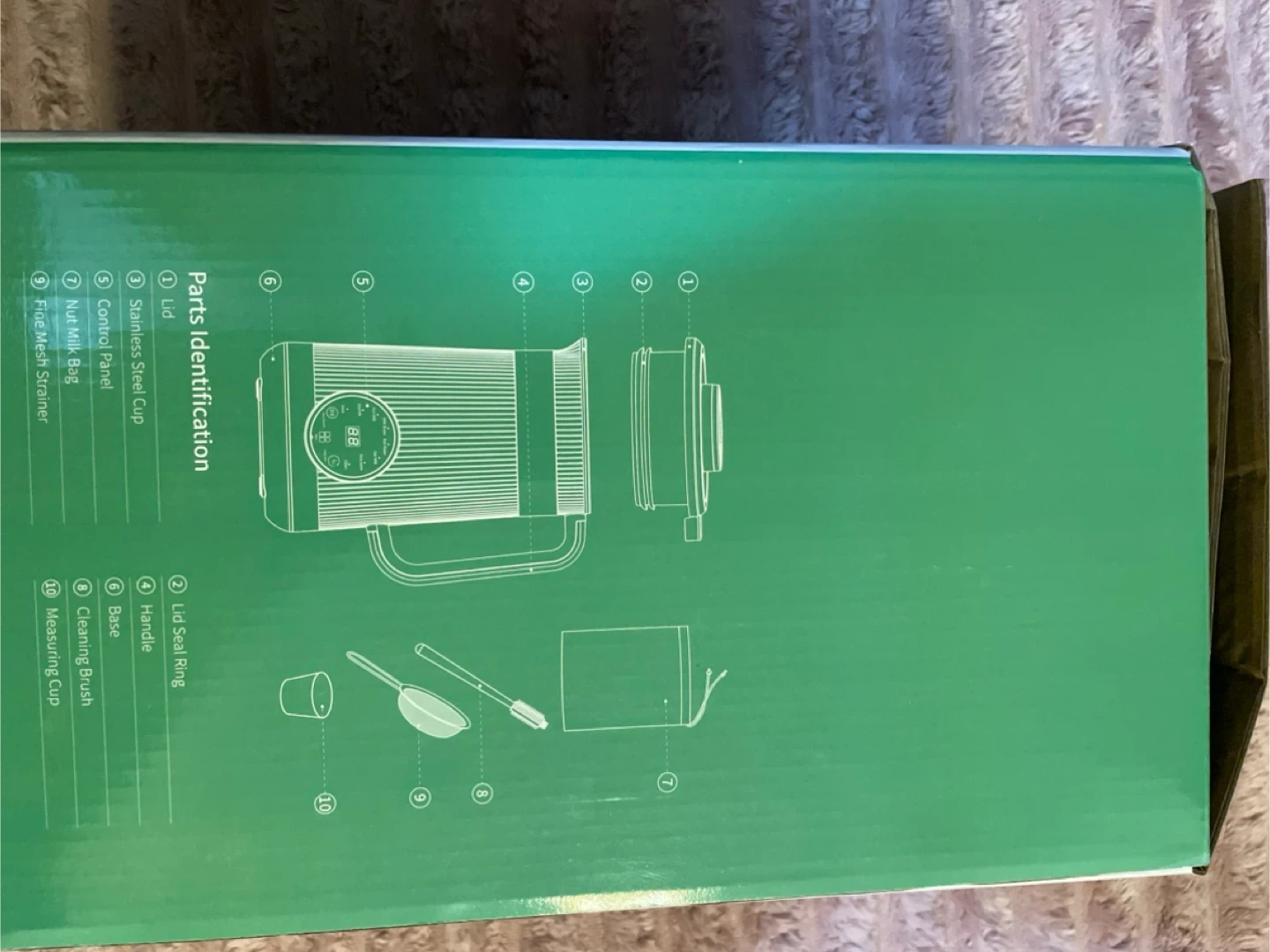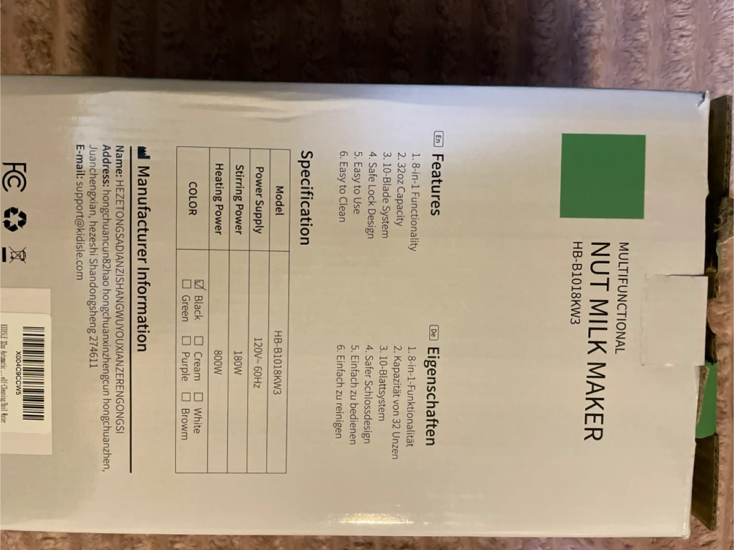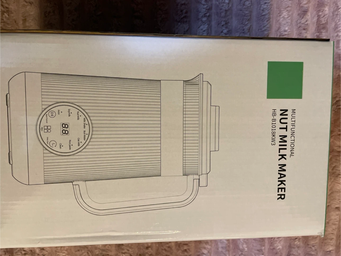 Selling a multifunctional nut milk maker, model HB-B1018KW3. It features 8-in-1 functionality and a 32oz capacity. The design includes a 10-blade system and a safe lock. It's easy to use and clean. The box includes the lid, stainless steel cup, control panel, nut milk bag, fine mesh strainer, lid seal ring, base, cleaning brush, handle, and measuring cup. It has a compact design for convenient storage and is constructed from high-quality materials