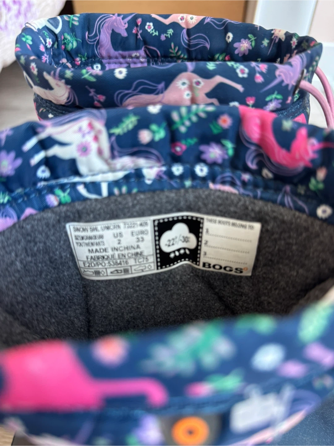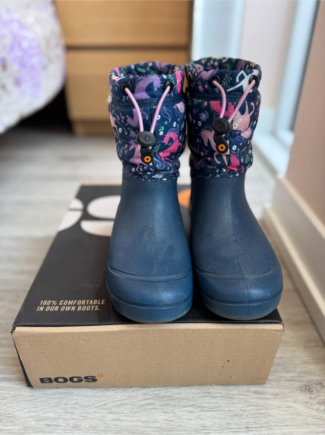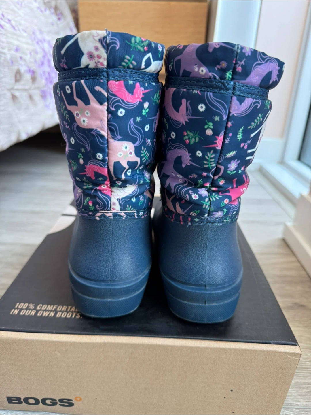These Bogs "Snowfall Unicorn" boots are designed for kids. They're waterproof and feature a fun unicorn print. Easy pull-on design with a drawstring for a snug fit.