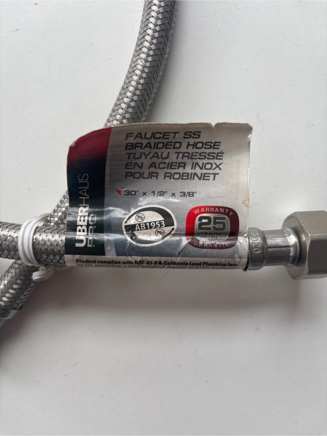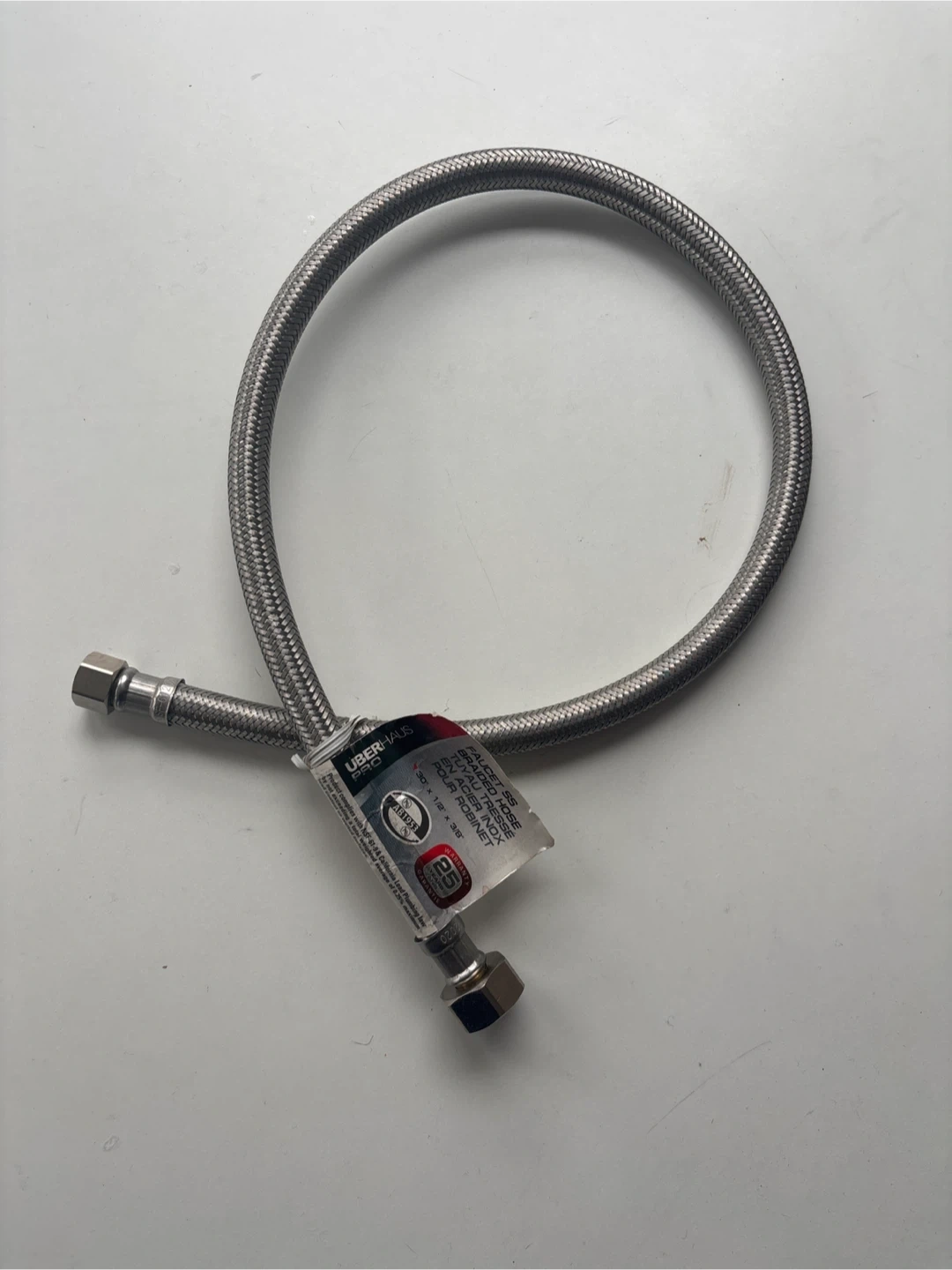 Flexible stainless steel braided water supply line hose for faucets. It's 16 inches long and connects securely with standard fittings. This hose is built for durability and reliable water flow.