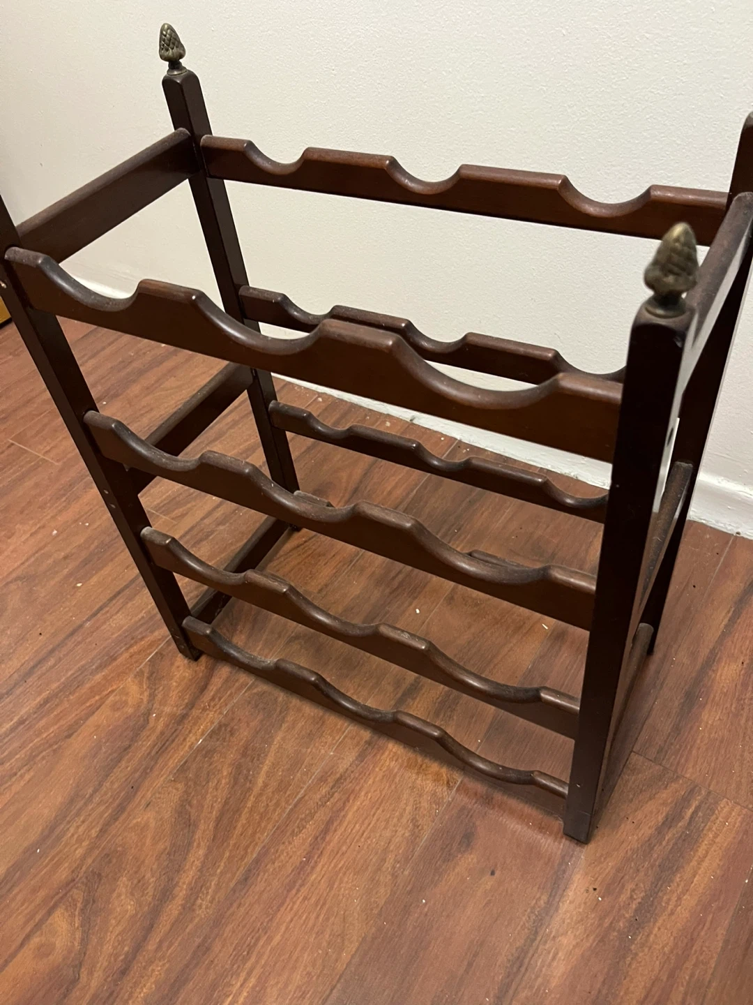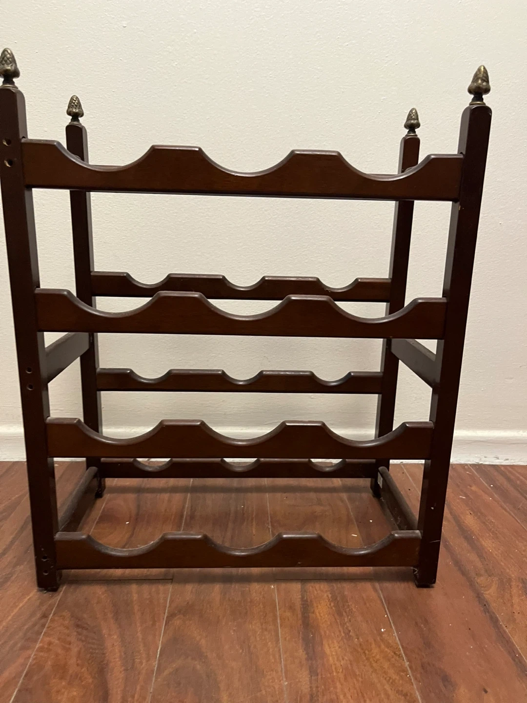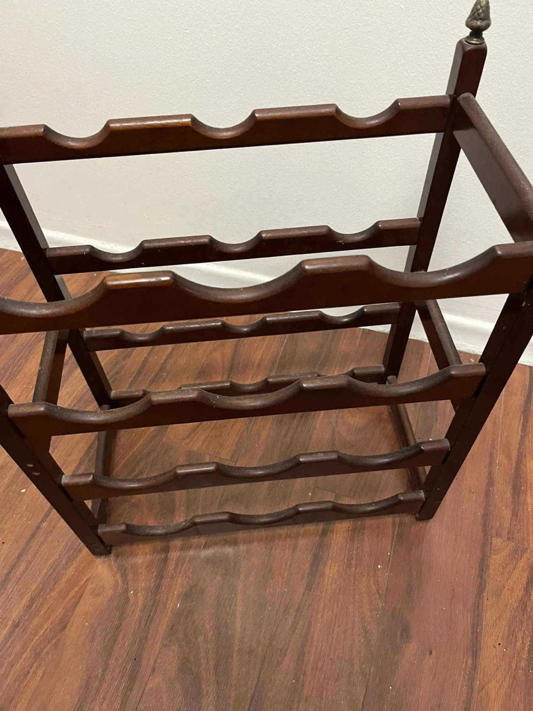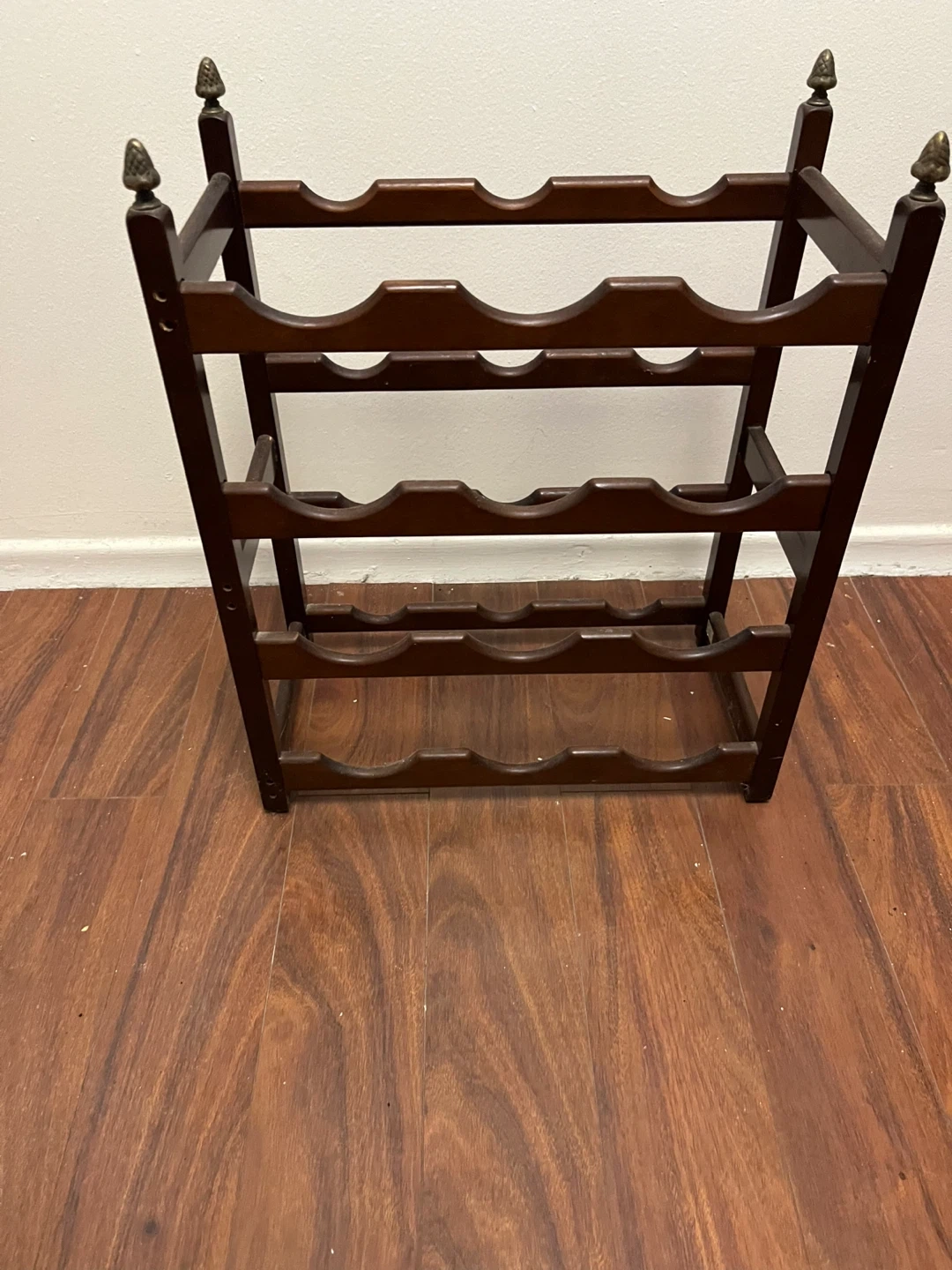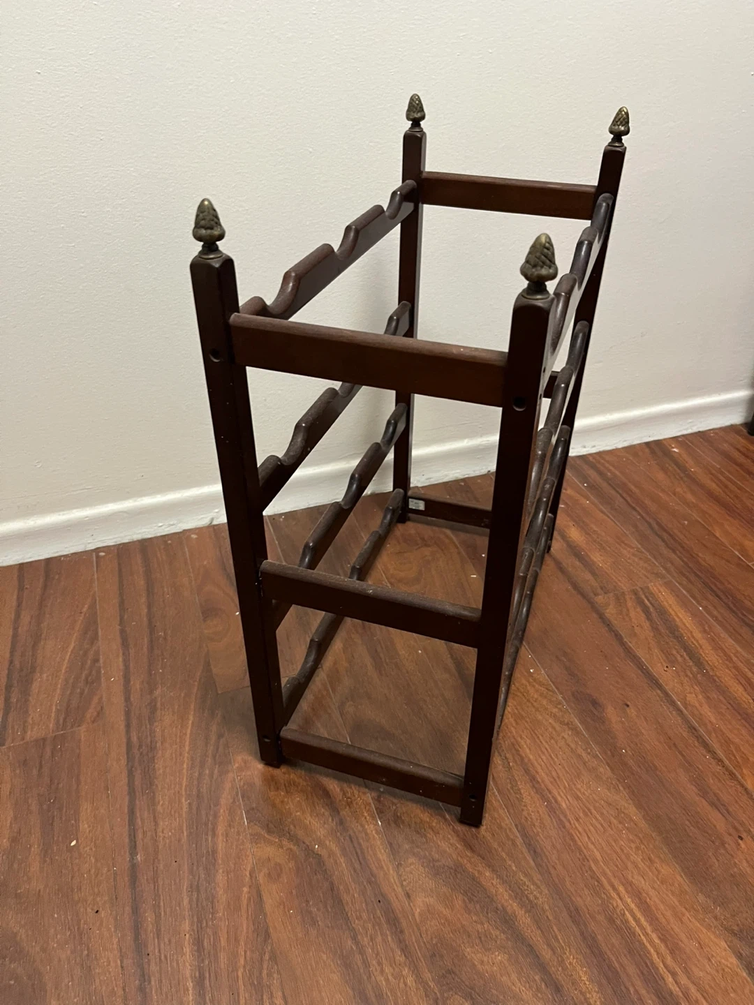 This is a dark wooden wine rack. It holds 12 bottles of wine across four tiers. This rack would be useful for storing your wine collection.