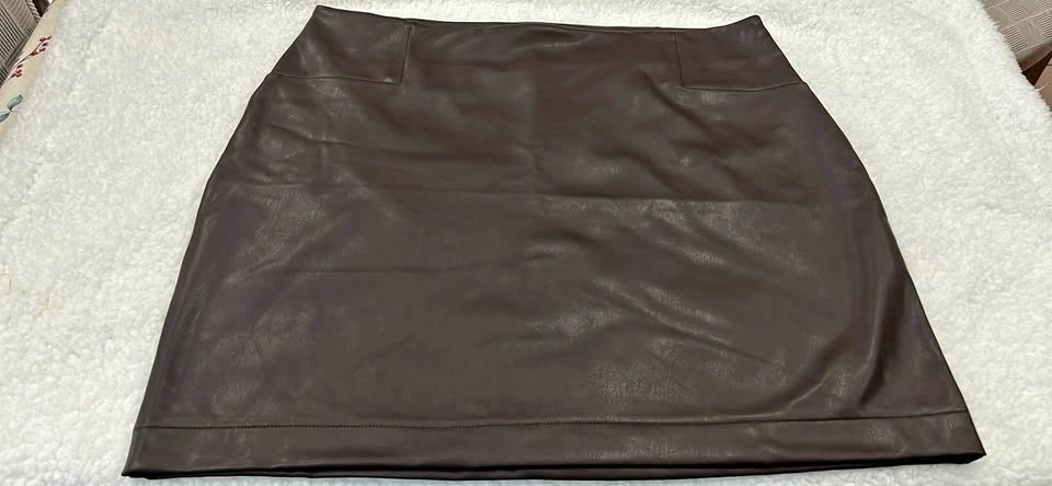 Stylish dark brown faux leather mini skirt. This skirt is super versatile, can dress it up or down. Great for fall/winter outfits.