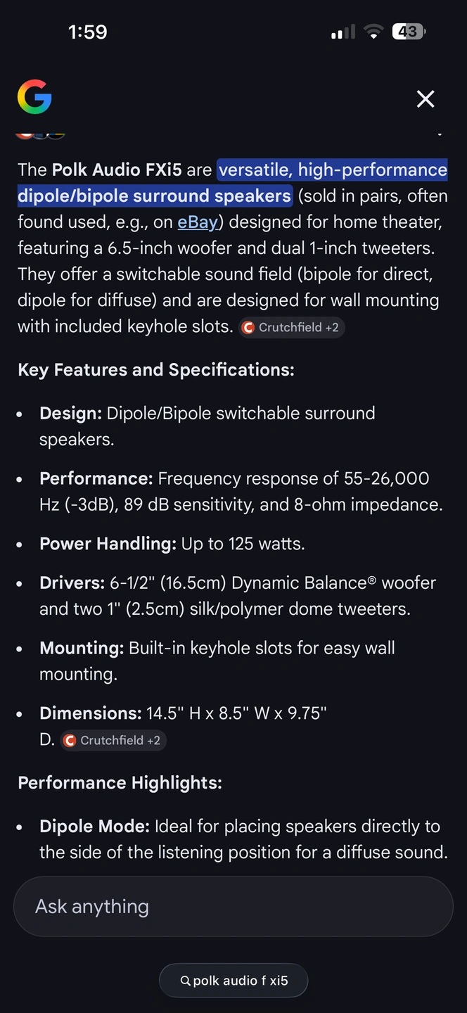 Pair of Polk audio f/xi5 speakers. Rarely used, just been sitting around. Speaker grills are perfect and they have brackets on the back for wall hanging. Great speakers!