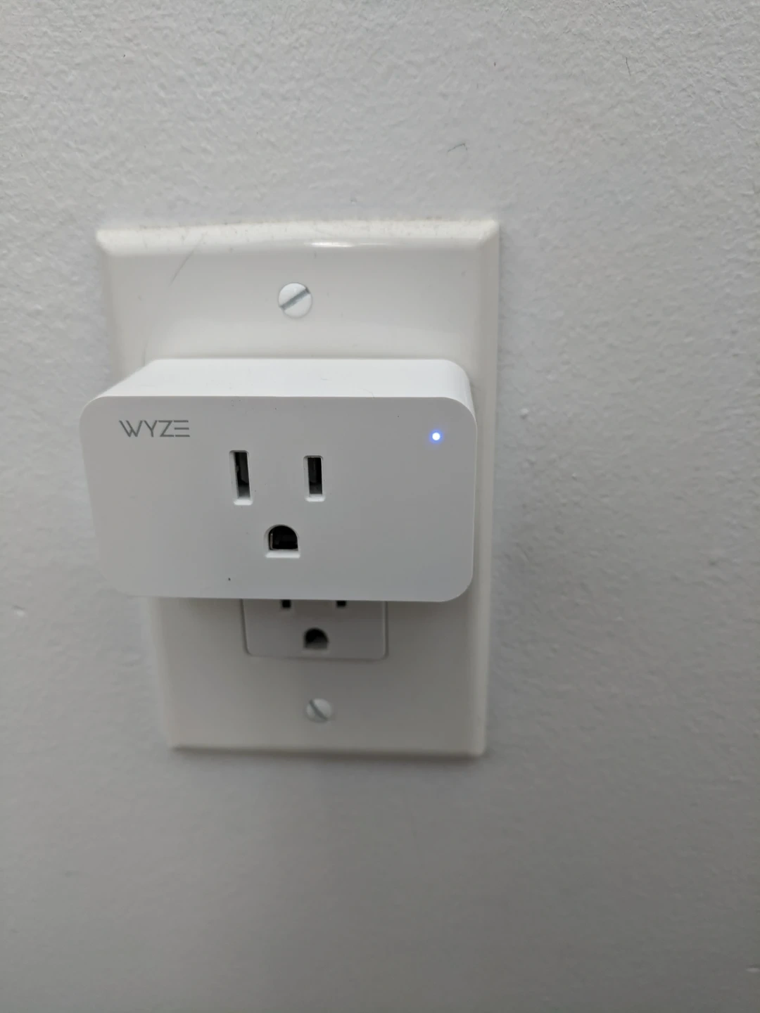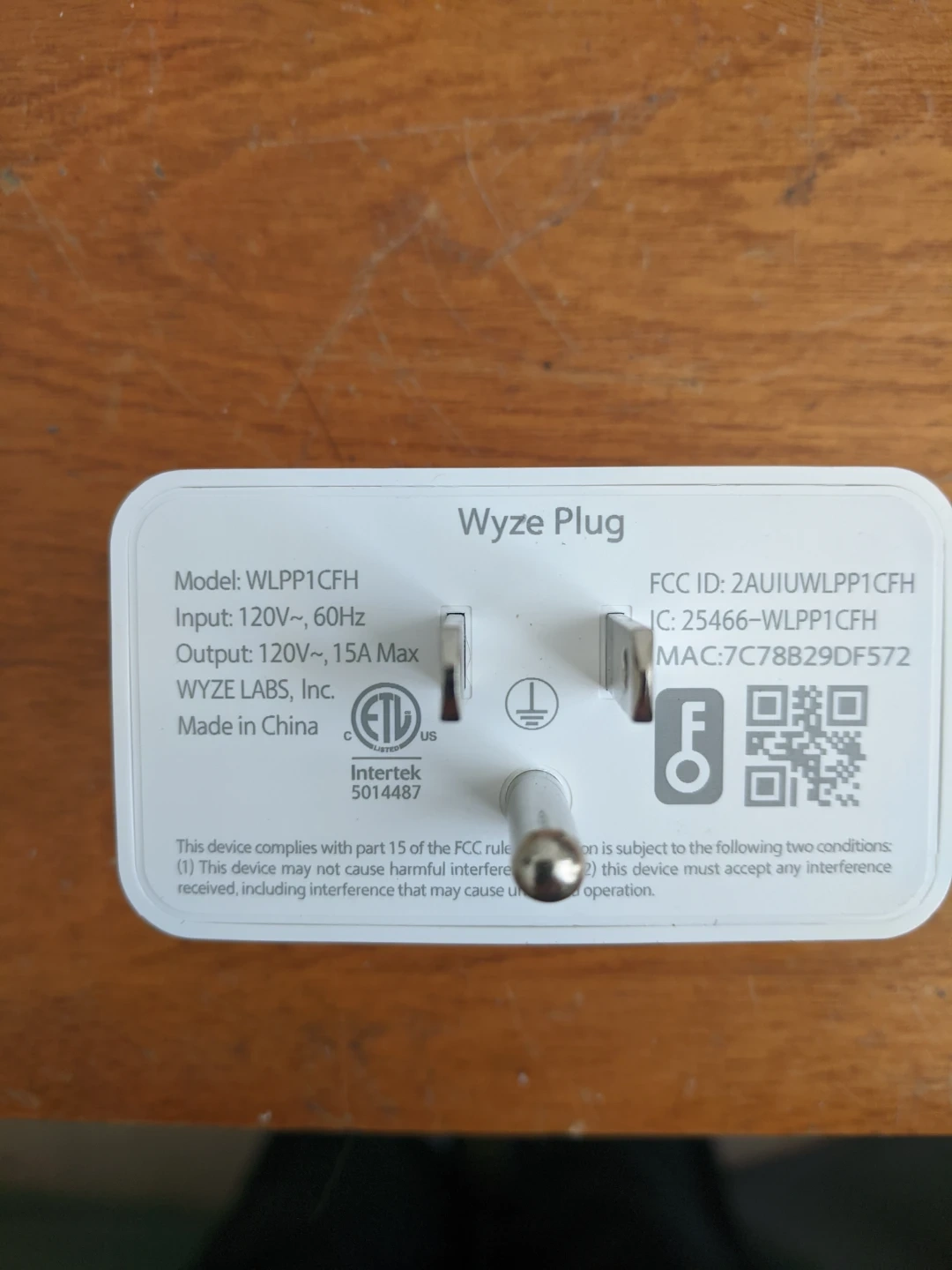 White Wyze Plug model WLPP1CFH. Connects to your home Wi-Fi for smart control. Rated for 120V~, 15A max.