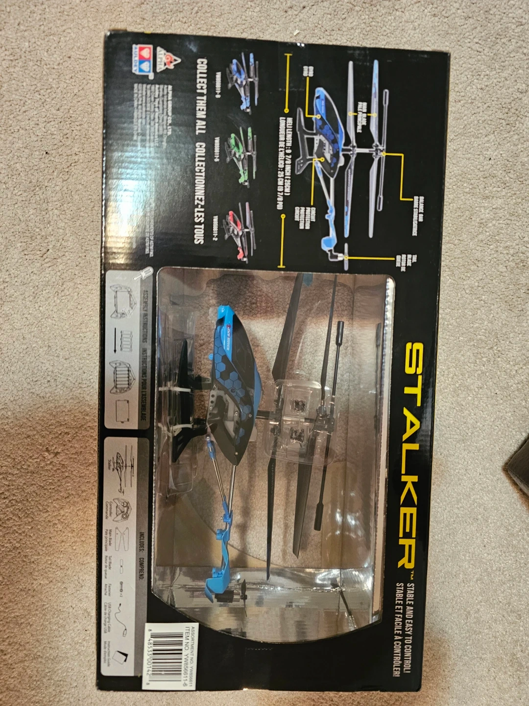 This is a Sky Rover Stalker RC helicopter for indoor use. It features 6-way control for manoeuvring. Comes with a USB charging cable. Recommended for ages 8+.